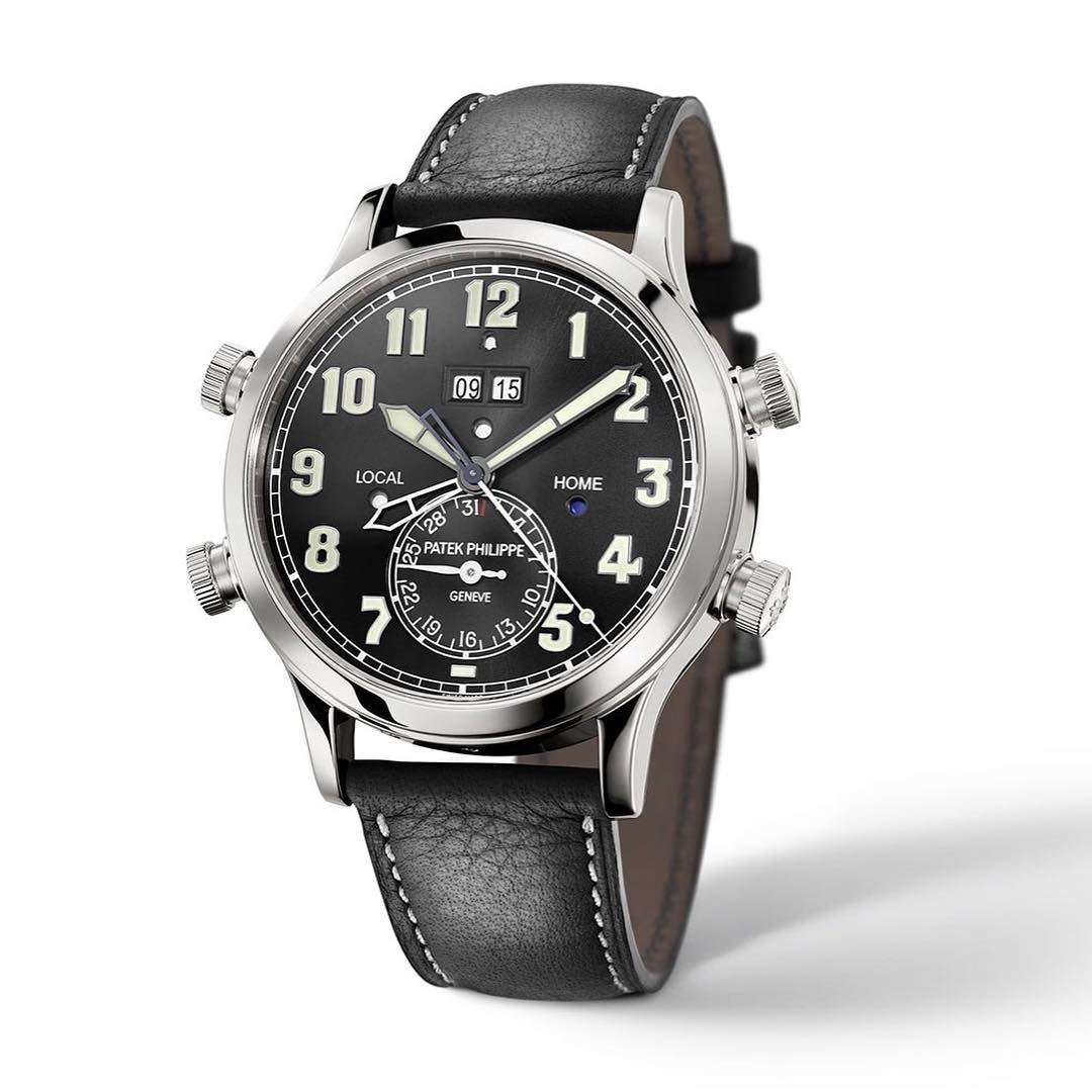 乍看編號5520P-001兩地時間響鬧腕錶,讓人想起百達翡麗另一款時計,腕錶於2015年問世的Calatrava 飛行員兩地時間腕錶。新款兩地時間響鬧腕錶一如百達翡麗旗下鉑金時計,在錶側6時位置鑲有一顆鑽石識別。面盤技術與優雅風格兼備,佈局確保清晰易讀,突顯源於飛行員時計的設計風格。錶面採納大型阿拉伯 數字及偌大的巴頓式指針,全由白金製造,並添上白色Superluminova 夜光塗層,與黑檀木色放射狀背 景對比鮮明。一如所有兩地時間腕錶,鏤空原居地時間時針在面盤第二平面緩緩移動。秒針線條修長, 尖端沿着路軌分鐘刻度轉動,刻度加上五分鐘圓點標示。腕錶搭配霧面黑色小牛皮錶帶繫於腕上,錶帶縫線與皮革對比鮮明與面盤合襯。錶帶以馬蹄形針扣牢定,展現飛行員時計專屬特色。