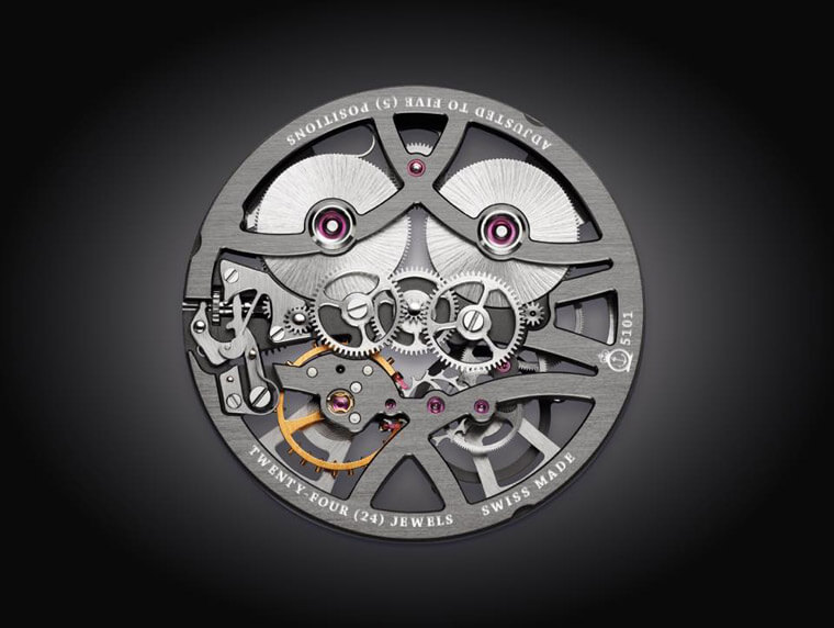 ▲A&S 5101機芯的震頻為21,600次、寶石數24顆,雙發條盒可以供應90小時動能,從背面欣賞還是能夠體會到品牌堅持的對稱造型思維。