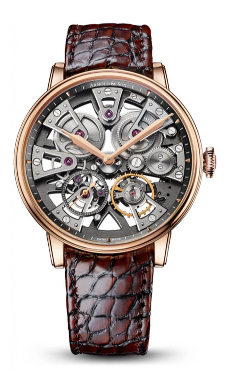 錶款面盤布局充滿巧思,首先在上半部可以看見左右兩枚對稱的發條盒,它們能合力輸出90小時動能,面盤的時分指針同樣以玫瑰金色呼應外殼,至於面盤下半部,前面提到可能會讓人誤以為是雙陀飛輪的設計,其實五點方向是擒縱系統、七點方向則是鏤空小秒盤,除此之外,機芯的傳動輪系與上鍊系統等,在鏤空設計之下從面盤看上去也已經一目了然,我們常會覺得想看機芯重要結構還要翻到錶背(如果有透明底蓋的話),但ARNOLD & Son在設計時顯然已經把這樣的觀賞效果考慮進來,因此面盤無論要看時間還是賞玩機械機芯都能一次滿足。
