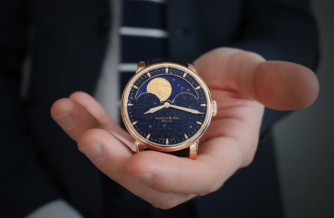 ARNOLD & Son亞諾錶的月相腕錶,一直以來都憑藉著其卓越的面盤設計製作,和品牌獨家研發的特殊機芯,受到市場的親睞,而在2019年亞諾錶推出全新HM Perpetual Moon月相腕錶,此次面盤改以一片藍色砂金石搭配精美的月相盤呈現新作。一方面延續了品牌製作天文複雜功能的傳統,另一方面亦展示出其豐厚的英國歷史和高級瑞士工藝。