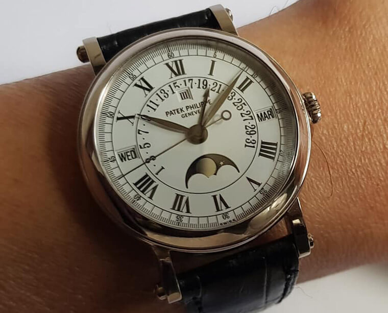 ▲曾士昕先生個人收藏的PP 5059逆跳萬年曆,它具有逆跳指針式日期顯示、122.6年誤差一日的月相功能,曾被譽為最美的萬年曆錶。