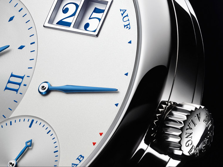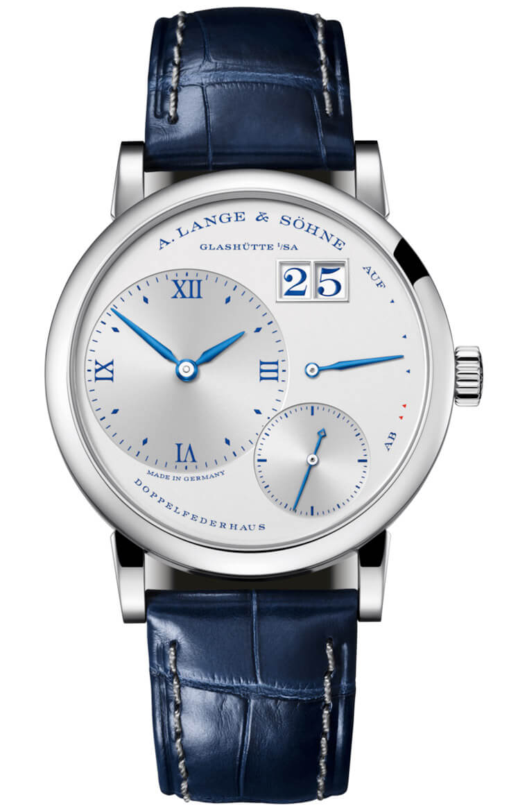 ▲藍鋼指針、藍色細節搭配白金錶殼為Lange 1 25週年紀念系列的共同設計語彙,至於錶款以德文標示的動力儲存顯示則是象徵了錶款的德國錶血統。
