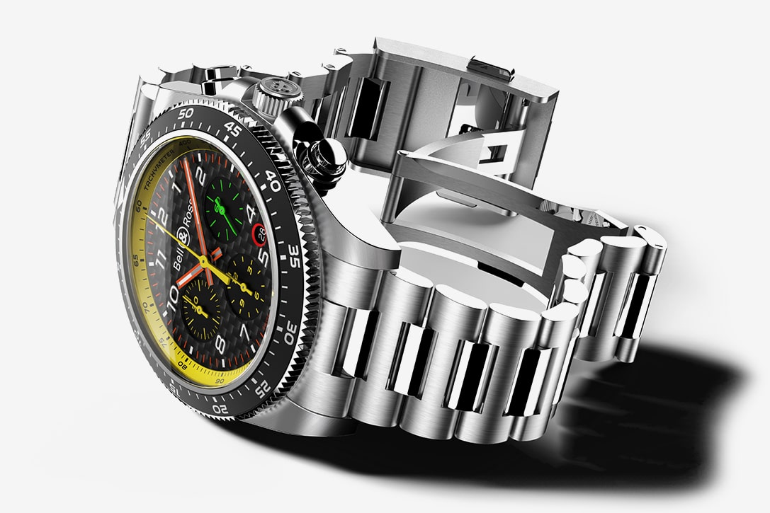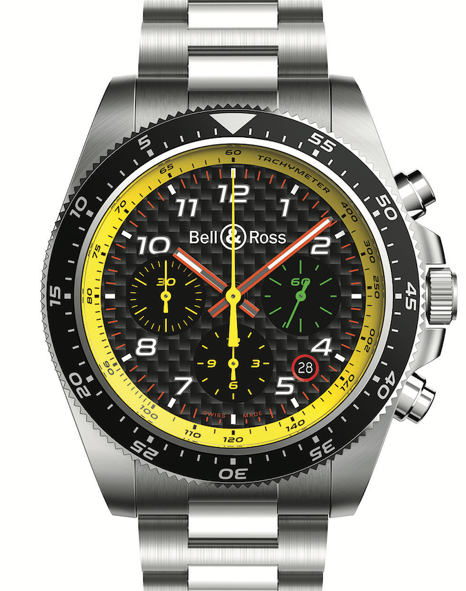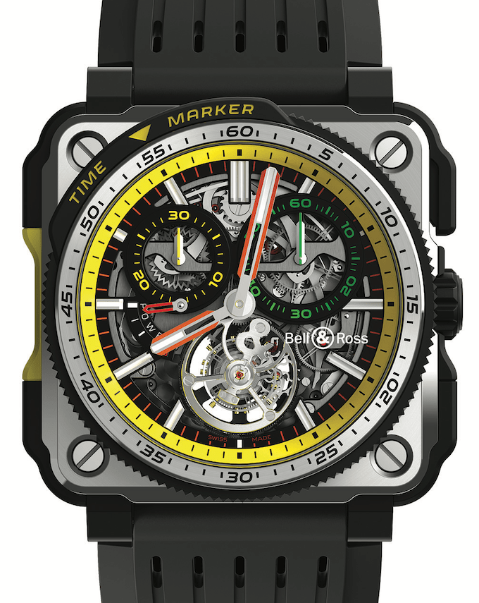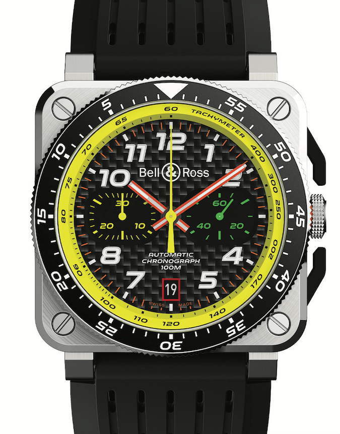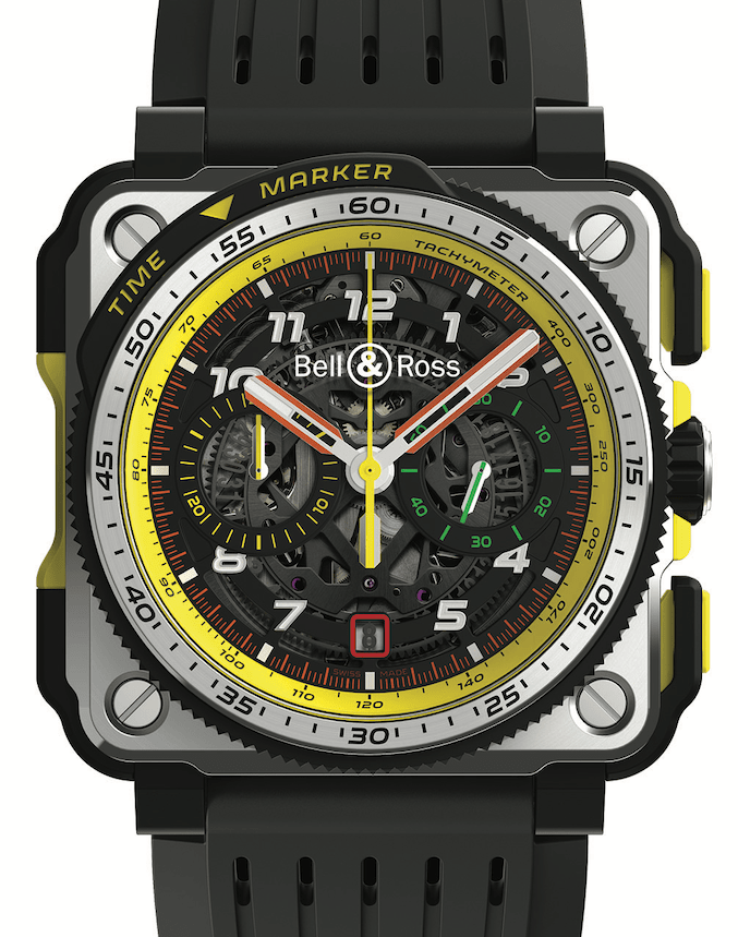 ▲從2017年開始每一款BR RS系列腕錶的配色都以自雷諾F1車隊的方向盤為靈感。然而這一次,在雷諾F1® 車隊代表性的黃、黑顏色基礎上,增加了以駕駛艙按鈕為靈感的綠、紅、橙色。
