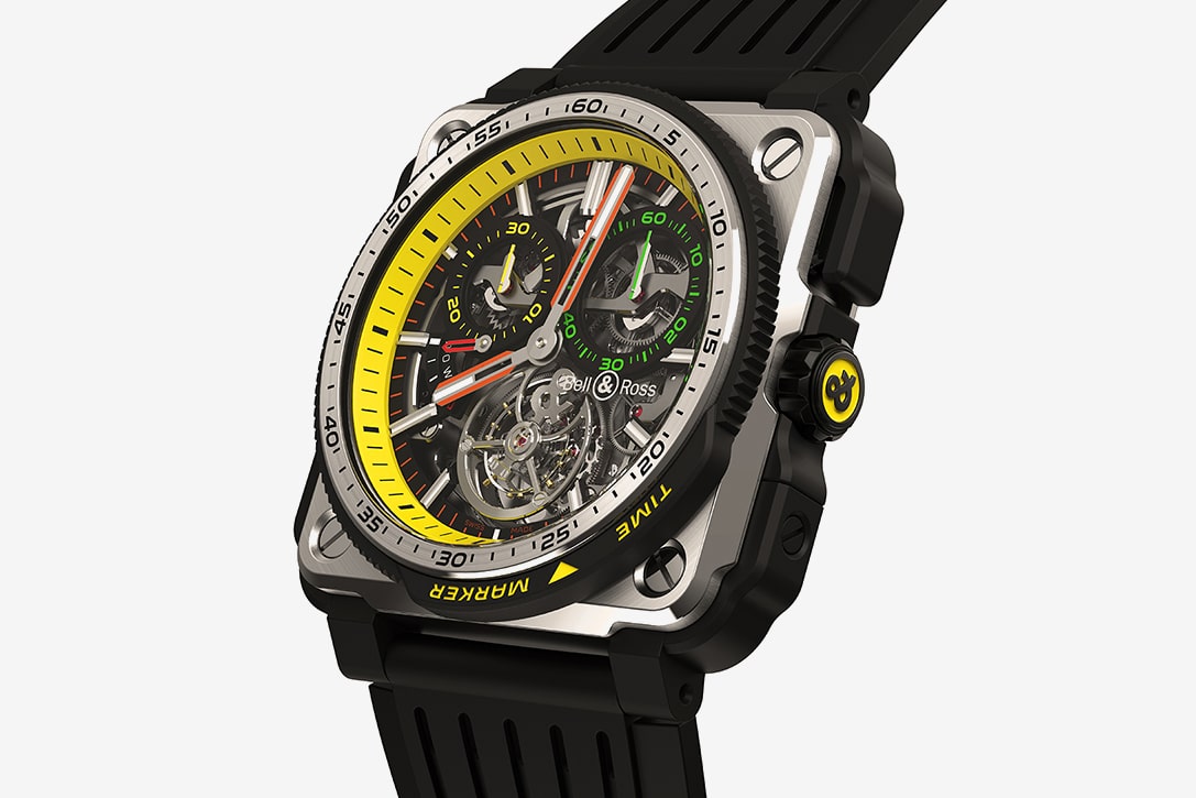 再來是BR-X1 R.S.19,此腕錶好比為手腕設計的活力賽車,所有功能完全以駕駛過程中的易操作性為設計考量,如符合人體工學理念的搖杆式按鈕適合佩戴手套操作,高度易讀的面盤在細節配色方面向駕駛艙的控制項看齊。2019年BR-X1的新增設計是面盤周圍的錶圈添加了「時間標記」。熱圈下來返回維修區的賽車手或他的團隊都可以立刻標記出計時碼錶功能的黃色運行秒針停在哪裡,方法是旋轉並對齊黃色三角形。第二圈後就可以立即對比兩圈的時間了。
