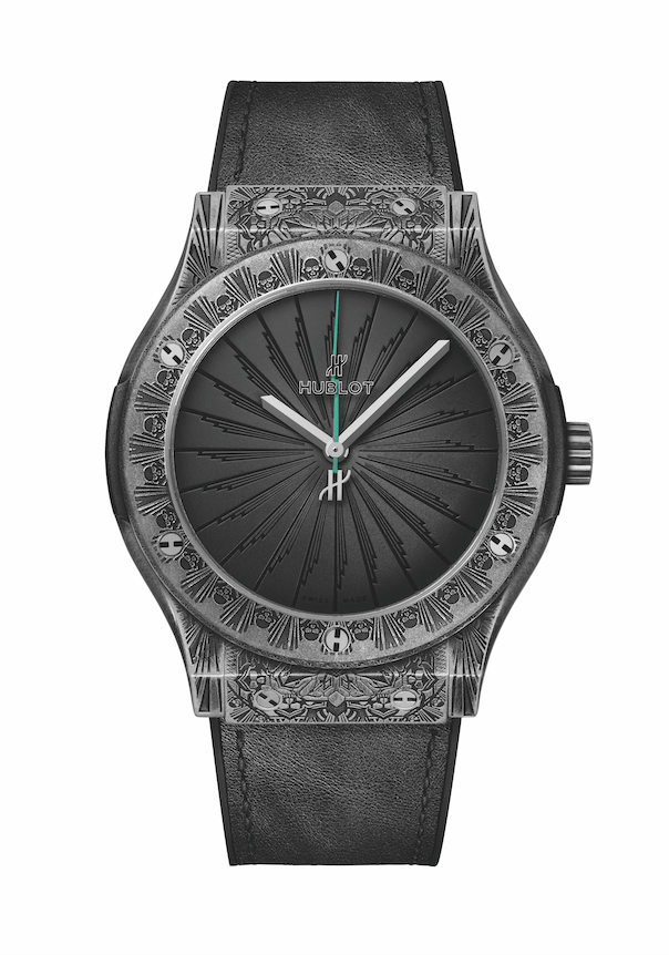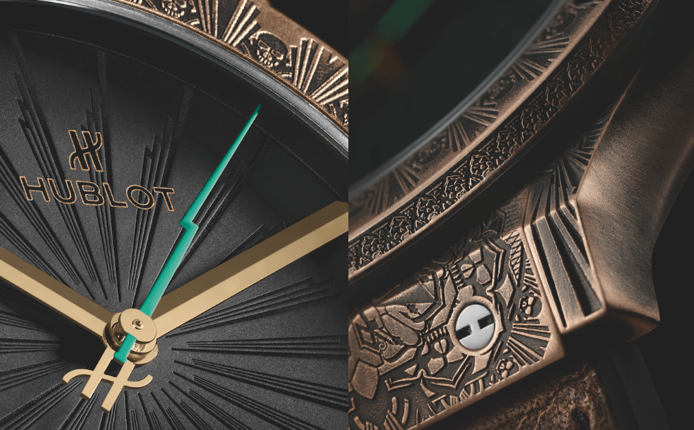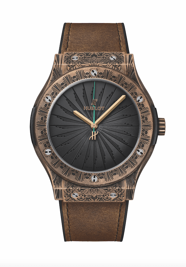 全新經典融合系列Wild Customs腕錶採用製琴師所使用的仿舊技法,以仿舊青銅和仿舊鈦金屬打造。錶圈上雕刻的骷髏頭為搖滾樂的經典象徵,並以裝飾藝術圖案,從錶殼到面盤刻畫腕錶。向先鋒派藝術精神與20世紀初的工業化歷史致敬,靈感來自帝國大廈與其雄偉壯麗的大廳。衝浪綠的亮眼秒針,散發著搖滾樂的能量,讚頌1950~1960電吉他黃金年代的前衛精神,以及無與倫比的創造力。