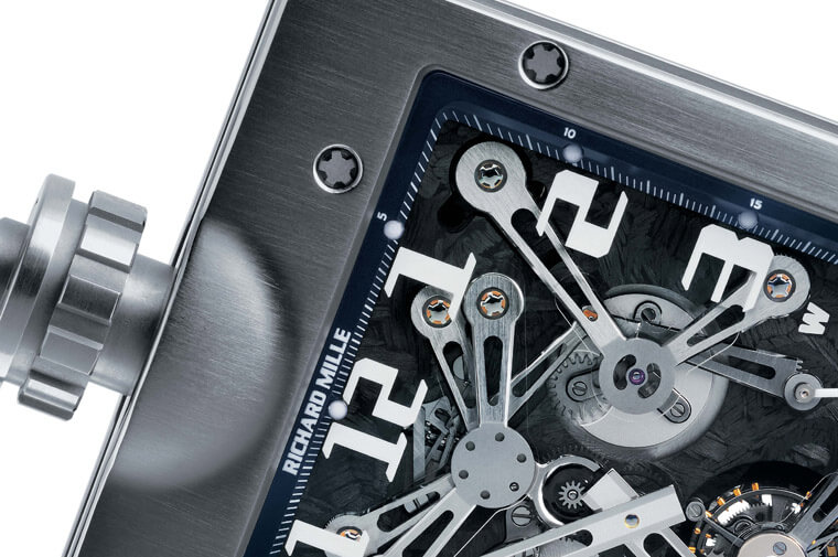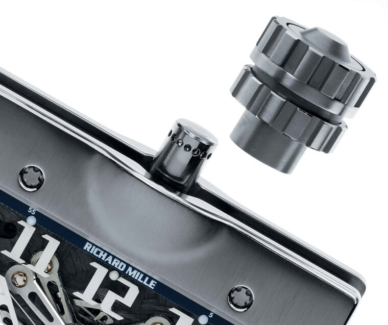 ▲錶圈上可見RICHARD MILLE招牌的5級鈦合金花鍵螺絲,除了外型很有辨識度,這種螺絲的設計其實是為了能更準確地掌控螺絲扭力,使其得以更耐用。