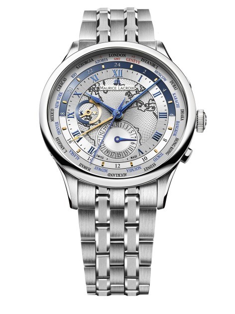 不銹鋼錶身與精雕細刻的錶盤就如通往世界之窗戶。城市名稱標注在錶圈邊緣,讓人驚歎不已。錶盤設計提供歐洲版和亞洲版兩個版本,爭相吸引你的目光。錶盤中央羅馬數字時標小時圈內,精心鐫刻世界地圖。歐洲版採用精美的巴黎螺釘雕紋飾,地圖邊緣以藍色勾勒,與指針、時標顏色和諧一致,無疑是經典格調。亞洲版則玩味色澤亮度對比:鍍銀錶盤,大陸部分飾以絲緞太陽紋,蛋白石的海洋,搭配玫瑰金時標與指針及藍色秒針……鮮明對比中充滿活力。