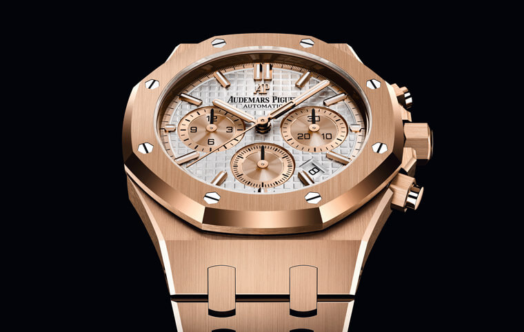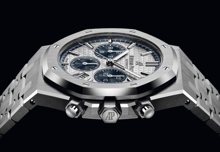 ▲愛彼皇家橡樹計時碼錶2019年推出38mm錶徑新款,與線上同步發行的41mm相同都採用Two Tone面盤配色,搭配RO系列經典的Grande Tapisserie,營造出獨具魅力的視覺層次。