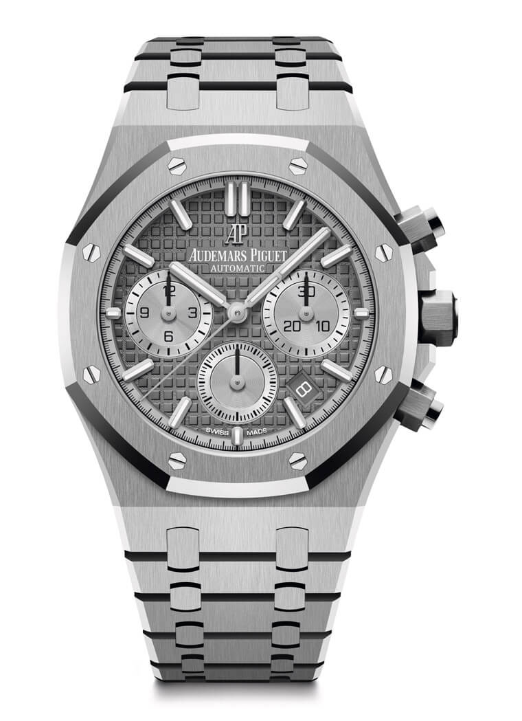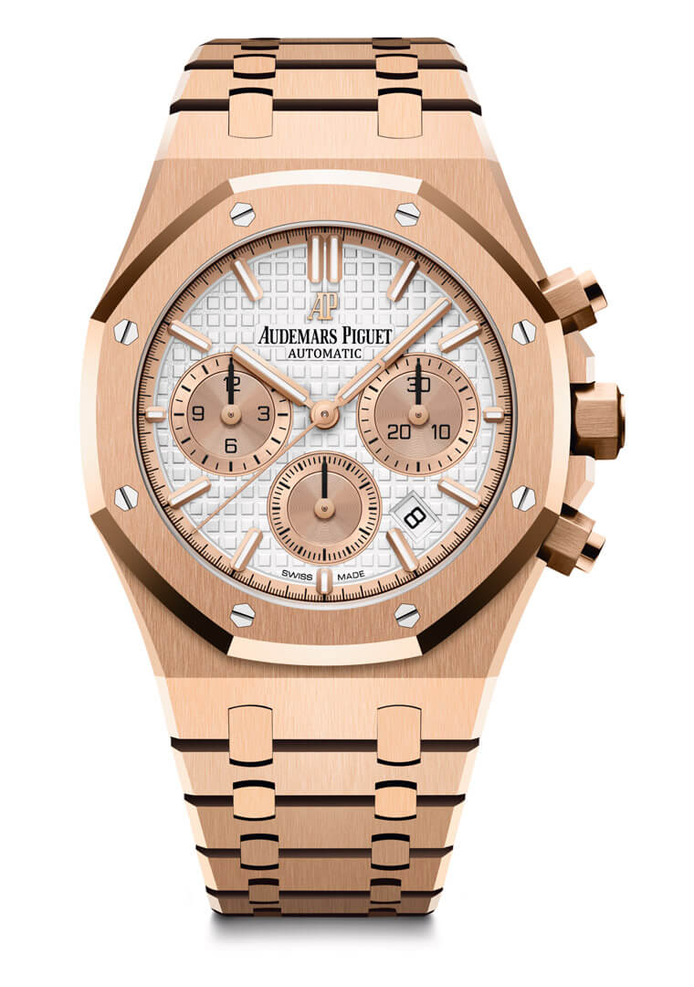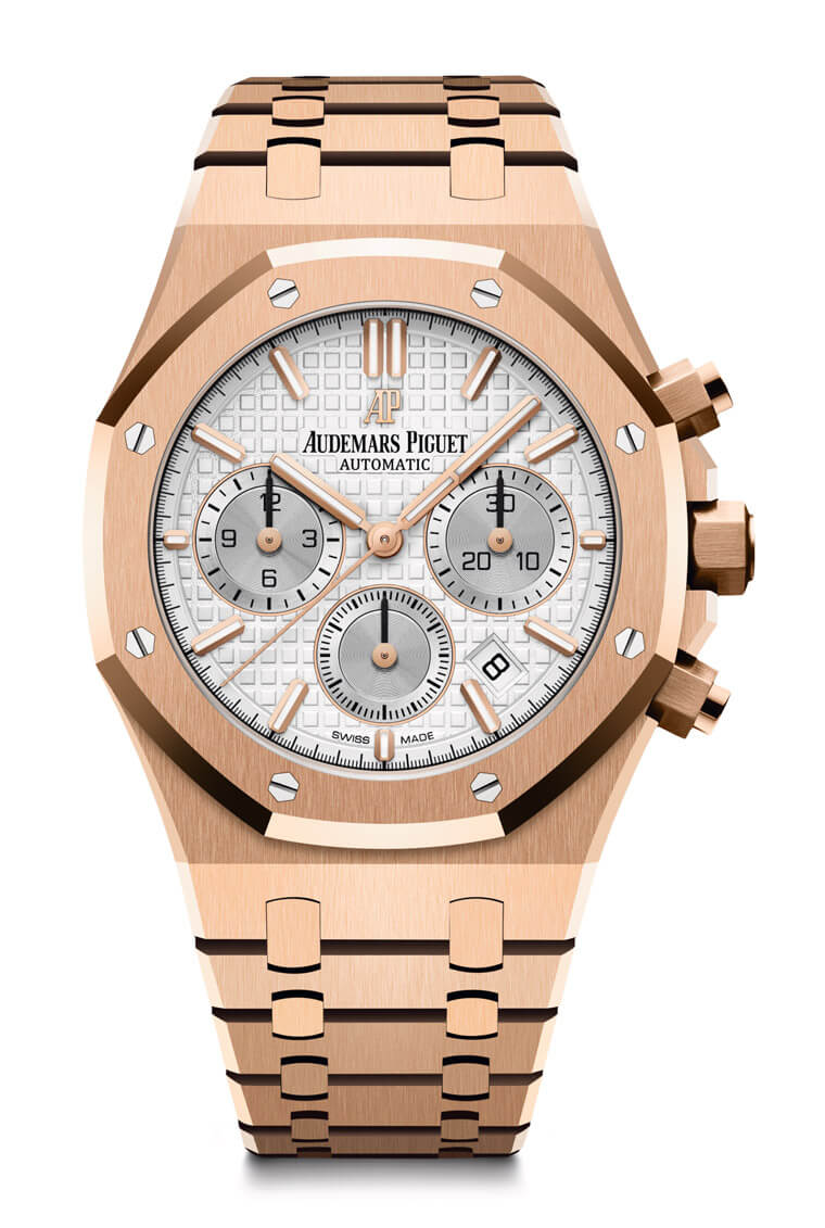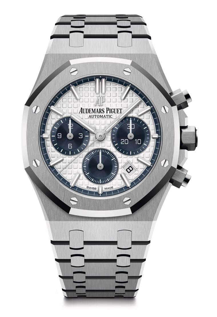 ▲皇家橡樹計時碼錶共同出不鏽鋼與玫瑰金兩種材質,前者有白面藍計時盤和深灰面淺灰計時盤兩種版本,後者則有白面金色計時盤和白面銀色計時盤等款式變化,提供消費者更多選擇性。