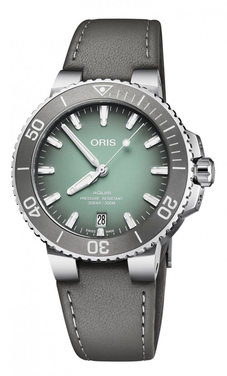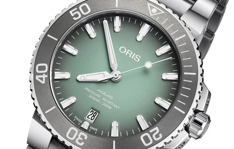 面盤絕對是Aquis潛水錶的重點,這款的指針和時標都填充了夜光物料以提升視覺清晰度,而且時標的立體感也能讓人感受到ORIS製作時的用心,它的日期窗一如Aquis Relief這些新作,同樣都設置在面盤六點方向,白底黑字的日期顯示對比性強,在光線充足的情況下看起來一目了然。前面提到了很多Aquis潛水錶的設計細節,但還沒輪到最重要的面盤配色部分,ORIS替這款覆上了一種特別的薄荷綠-灰色漸層,過往我們常看到的Aquis手錶,面盤往往都是帶有金屬太陽紋的設計,不過這次的薄荷綠-灰色漸層面盤卻沒有我們印象中的那種金屬感,反而是霧面並帶點粒紋效果,薄荷綠色從面盤中央慢慢往四周變暗轉換成灰色,灰色彷彿像是從此一路延伸到錶圈般,因此看起來多了一種立體的陰影感,要說它是今年Aquis系列最特別的面盤配色,應該不算太誇張的形容。
