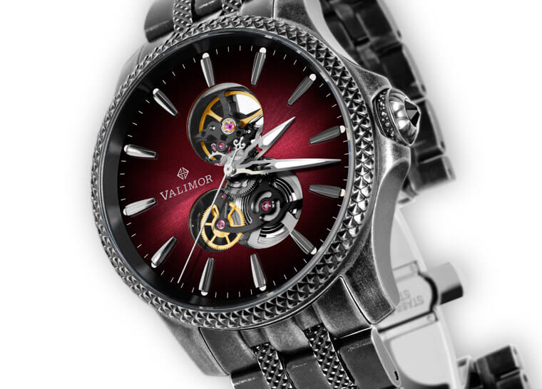 VALIMOR的腕錶強調原創性和獨特性,除了機芯外,它的每一個組件也是由設計師Raymond Jones與其團隊獨立研發,以一致的主題設計互相呼應,並透過專業和精心細緻的作工把它們一一實現。首兩個腕錶系列Caliburnus和Makaidos的錶殼靈感源於亞瑟王由龍鱗組成的盔甲,由熟練的技師透過微細的雕刻和打磨把每一片哥德式建築的尖拱特徵互相重疊、把堅硬的316L不鏽鋼轉化成立體的龍鱗錶殼;其王冠形龍頭鑲嵌著暗黑施華洛世奇水晶,進一步彰顯神祕的王者魅力,創造出品牌標誌性的輪廓。