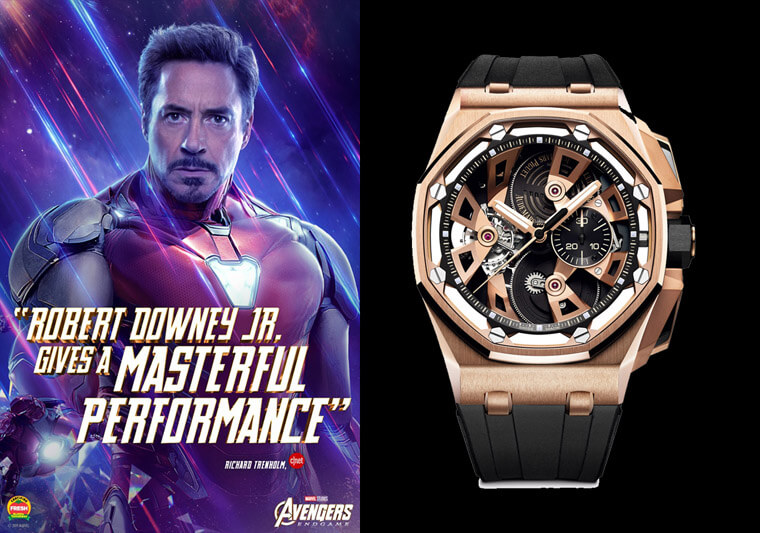 鋼鐵人是過去十年漫威宇宙電影的起點,身為開國元老的他陪伴影迷的時間最久,也是串聯復仇者聯盟的重要角色,他聰明、風趣加上一點刀子嘴的個性贏得了許多影迷的愛戴,在《復仇者聯盟4:終局之戰》裡面也扮演著很關鍵的角色,而選擇愛彼2018年推出的皇家橡樹離岸型系陀飛輪計時碼錶和他配對有幾個原因,第一是鋼鐵人裝就是要陽剛、霸氣,這點ROO很符合,再來鋼鐵人代表的是前衛先進的科技,這也是這款ROO呈現給錶迷的感覺,而身家財產相當高的東尼史塔克,以錶款的玫瑰金材質來比喻也很適合,還有這款錶9點方向的陀飛輪裝置,似乎也有幾分鋼鐵人身上方舟反應爐的味道。