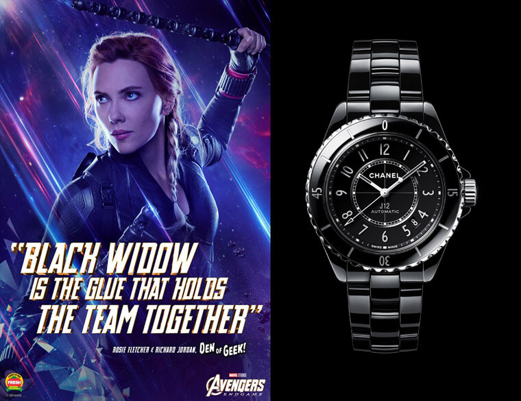 黑寡婦雖然沒有上天下地的超能力,但她出色的間諜滲透能力和紮實的武打功夫,是在她美豔外表下容易讓人忽略的特點,加上她喜歡穿著深色戰鬥服的這點讓人想到了香奈兒的經典款J12,黑色陶瓷殼的J12也是只有三針加日期的實用功能,但是它兼具了外型魅力、強硬的外殼保護性以及不花俏但好用的顯時功能,而且J12 2019年改換上出自KENISSI專業製錶廠手筆的自動機芯,如此紮實的內涵也象徵黑寡婦予人的狠角色形象。