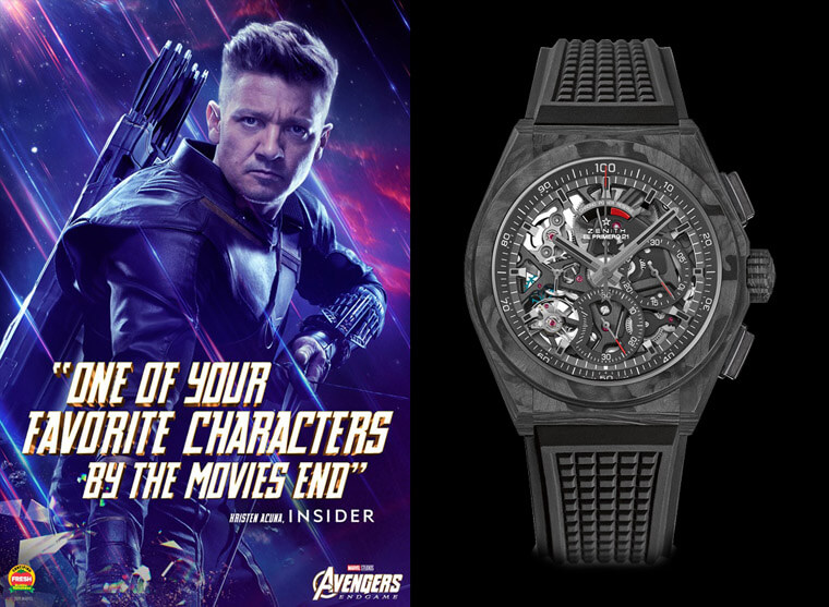 鷹眼也是屬於凡人中英雄,他能與眾多神人並列的關鍵就在於一手精準的射箭技術以及高超的武藝,而他在《復仇者聯盟4:終局之戰》因為家人遭逢彈指意外而化身成為浪人的黑色裝扮都跟真力時Defy El Primero 21 Carbon有互相呼應的感覺,這款錶除了外觀碳纖維材質的黑色調與浪人模式的鷹眼很搭,它的輕量化也代表著鷹眼的靈敏反應能力,再者它的計時功能能精準到1/100秒的程度,就像鷹眼百發百中的射箭技巧般讓人歎為觀止。