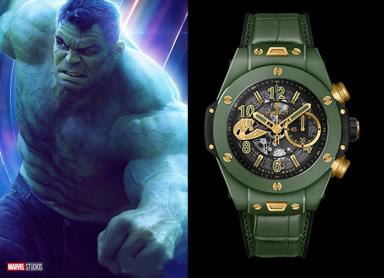 雖然勞力士的綠水鬼素來有浩克的別稱,但這樣的配對稍感太老套也太好猜,因此小編認為用宇舶Big Bang Unico WBC綠色陶瓷計時碼錶來比喻浩克也不失一種選擇,首先當然是因為這款錶從錶殼的綠陶瓷到綠色鱷魚皮錶帶從頭綠到尾就跟浩克一模一樣,另外綠水鬼本身錶徑40mm相對於浩克的大塊頭會有點太秀氣的感覺,但是宇舶這款綠陶瓷計時碼錶可是有45mm的錶徑,就像浩克一樣粗勇的身形,而且錶款本身與拳擊界的聯名意涵,也能呼應浩克強悍的戰鬥能力。