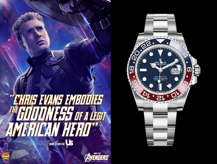 小編必須承認這不是什麼有創意的配對,但是美國隊長經典的藍紅配色,立馬想到勞力士百事圈完全合理啊。目前GMT-MASTER II百事圈共有不鏽鋼的126710BLRO和白金的126719BLRO,後者又還有藍面和隕石面之分,如果從這三款中挑出一款最符合美國隊長的款式,小編傾向選擇126719BLRO藍面,因為美國隊長盾牌上面的藍紅配色和雙色陶瓷圈很合拍,而白金錶殼的稀有珍貴性比起不鏽鋼又更能呼應盾牌的汎合金材質,而之所以選藍面就不用多說了,看看美國隊長制服主要是什麼顏色就知道囉。