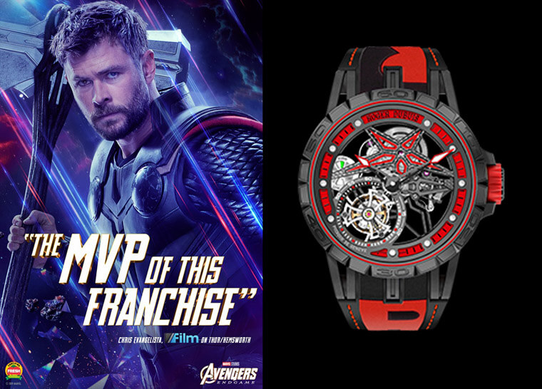 索爾本身就帶有阿斯嘉王國眾神之主的身份,而RD的Excalibur王者之劍系列也能讓人聯想到這種尊榮的身份,而索爾驍勇善戰的特質就如同這款錶外觀的霸氣造型,其中鏤空面盤可見品牌特殊的星形鏤空設計,這點也能和索爾是來自宇宙遙遠星系的背景進行連結,此外錶款在刻度環、錶冠甚至橡膠錶帶上都點綴了紅色系,是不是看起來也有點像索爾很愛穿搭在鎧甲背後的紅披風呢?還有錶款的陀飛輪移除了上層橋板,所以它是被暱稱為飛行陀飛輪的設計,而索爾只要有雷神之錘在手,他也是擁有飛行能力的好手。而且就連陀飛輪框架的凱爾特十字造型也有點風暴毀滅者的Fu,這只錶長的真的很雷神。