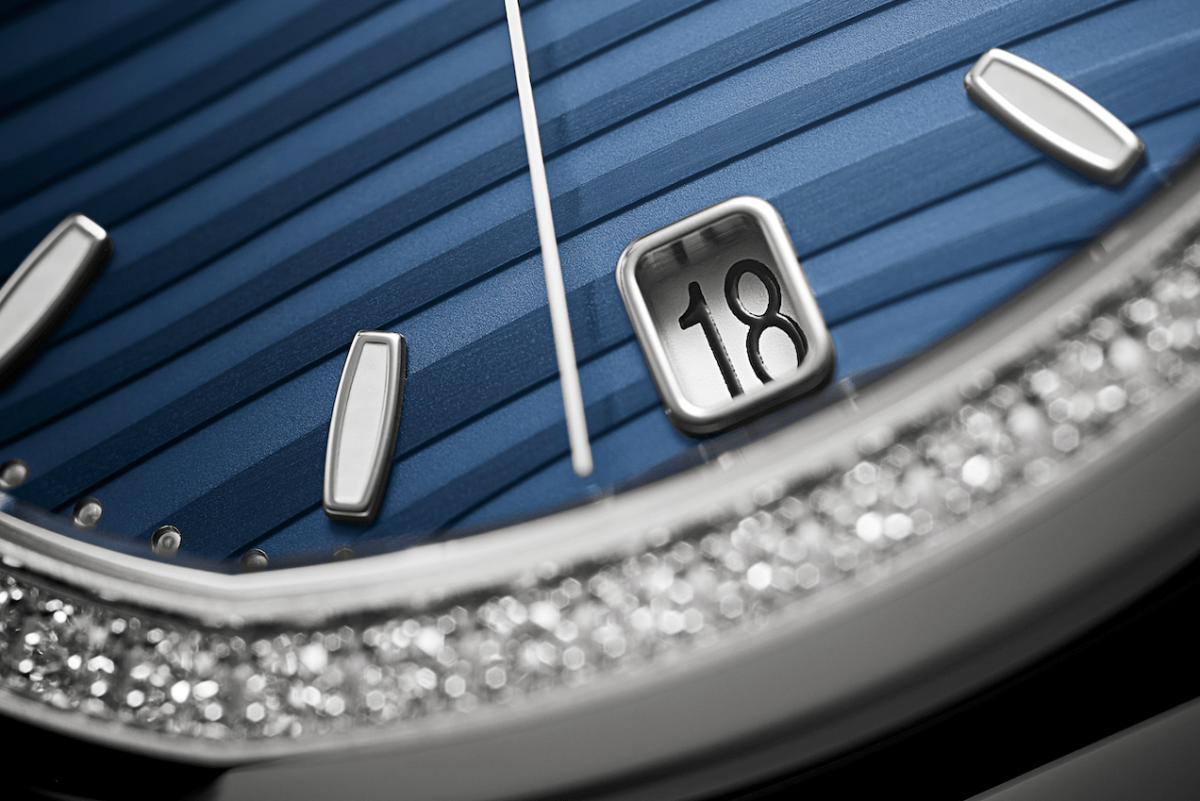 除了錶徑的改變,百達翡麗亦改變了面盤的顏色,分別為藍調乳白色、銀調乳白色以及灰調乳白色漸變周邊黑色,以求與面盤的橫向凸紋更加相襯。三種面盤顏色與鋼材色澤及鑲嵌在錶圈上的56顆頂級鑽石相襯得宜。面盤上6點鐘位置的日期顯示窗,以白金外框詮釋與面盤搭配得宜。