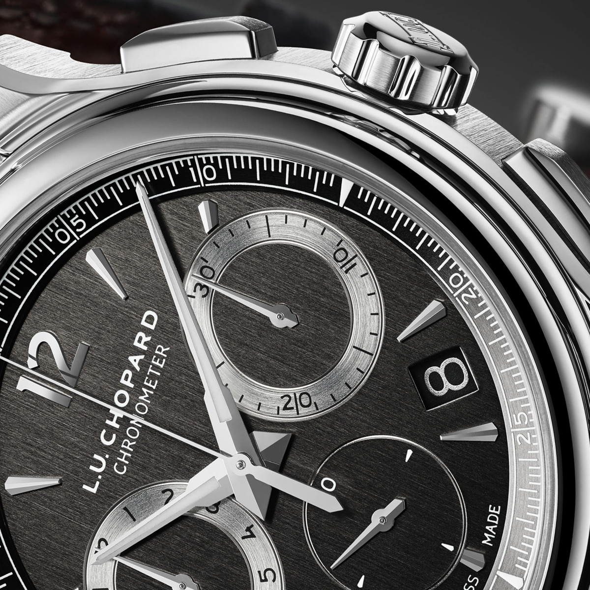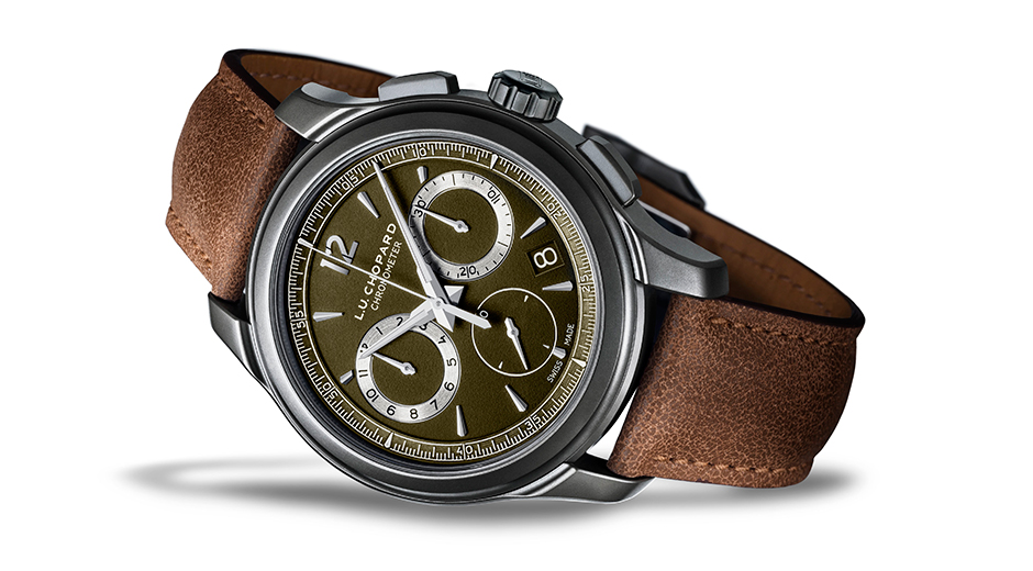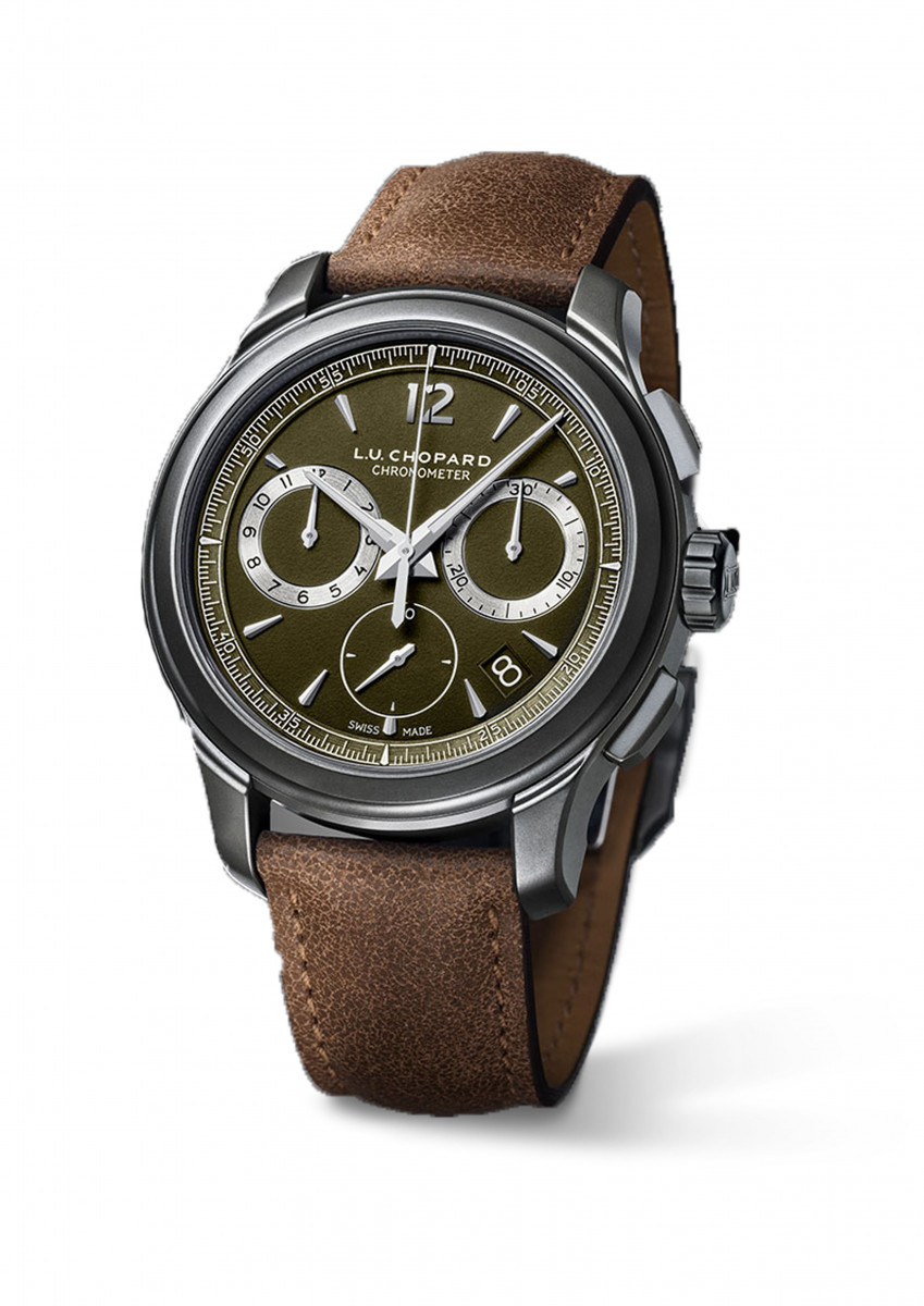 灰色調的L.U.C Chrono One Flyback以不鏽鋼製作,採用L.U.C系列的特有潤飾,錶緣經垂直緞光處理,錶圈和錶耳施以拋光打磨。灰色面盤飾以精緻的垂直緞光打磨圖案,呈現時尚休閒、低調含蓄的深淺同色效果。而帶有軍事風格的綠色款式,巧妙玩味L.U.C系列前所未有的色彩配搭,突顯充滿陽剛氣息的運動風格。軍綠色面盤點綴不鏽鋼時標、指針及灰色圓環。綠色Titalyt®性能卓越,外觀亦散發低調陽剛氣質,與蕭邦創作優雅現代的計時碼錶的理念相契合,展現時尚風範。