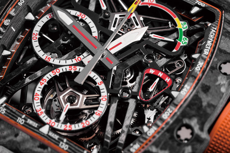 錶款本身的功能是追針計時陀飛輪,陀飛輪埋在6點鐘位置的小秒盤底下,而錶面上半部醒目的兩個弧形顯示區則分別是用於表示動力儲存和扭力。一如RM過去所擅長的,錶款在機芯和錶殼間連結的結構上也有巧妙,這裡他們取經自F1賽車的懸吊系統,以TPT®碳素鋼製作了一組固定架來抓住機芯,經過實測成錶可以承受5,000G的衝擊,符合RM對旗下作品強度一貫的標準,再次詮釋真正賽車錶的定義。