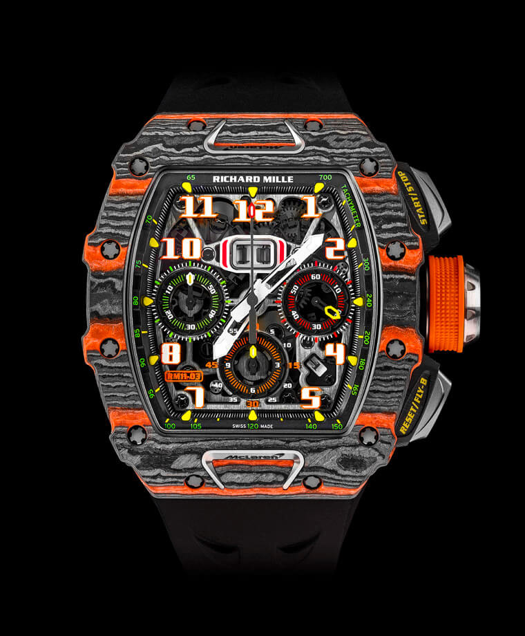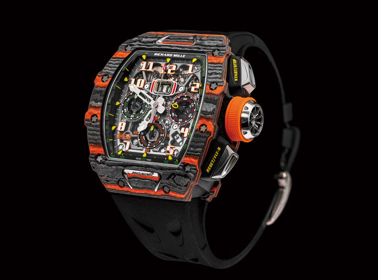 RICHARD MILLE 2018年時和McLaren攜手打造雙方最新的限量腕錶——RM 11-03 McLaren自動飛返計時碼錶。這款令人期待的聯名腕錶注重材質、細節和設計,融合McLaren跑車設計特色與輕量化技術,反映品牌價值理念的同時,也兼顧了美學和功能等層面。