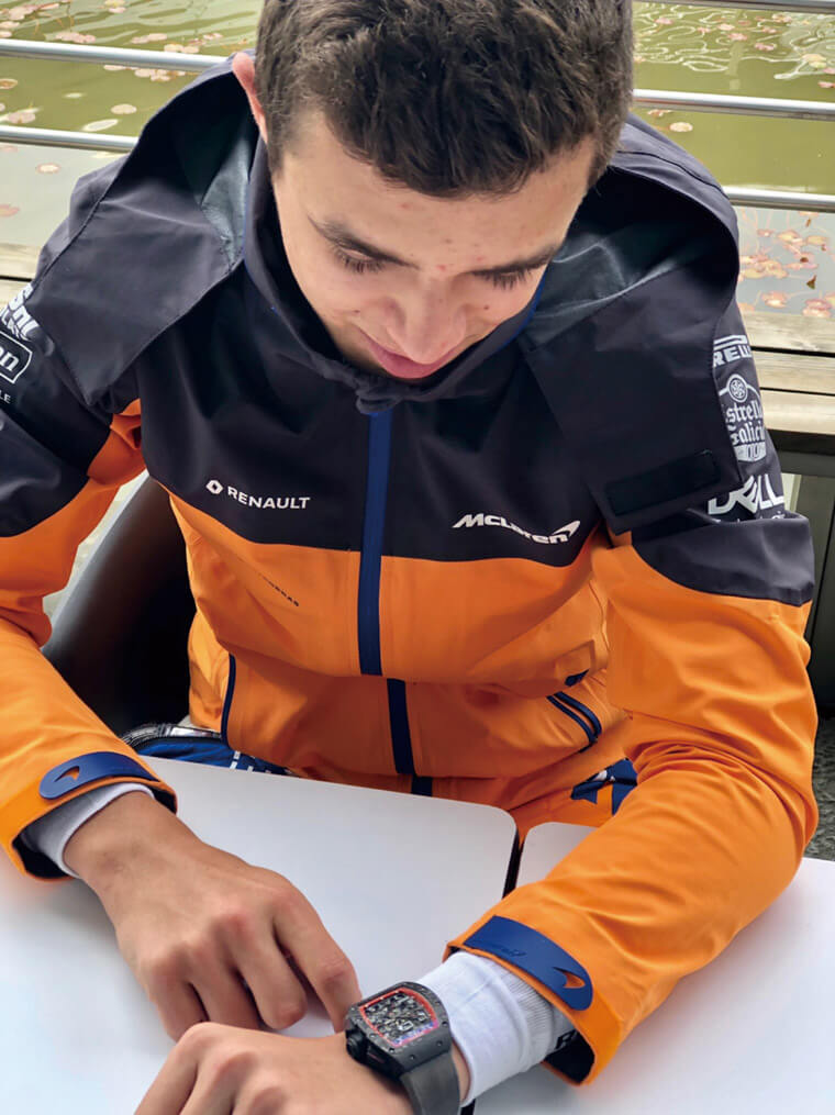 Lando Norris本身是一位很有想法的車手,過往在F2層級以前的比賽,Norris曾經嘗試過自行設計頭盔與賽車服等等,升級到F1之後,各項裝備都有專人處理,讓車手可以更專注於提升比賽成績,例如他當日所佩戴的RICHARD MILLE RM 11-03腕錶就讓他印象深刻,這款錶擁有計時功能的複雜度,還有看起來很清楚的大日期窗,就連自動盤也設計成能隨著佩戴者活動而自主調節上鍊效率,加上由TPT®碳纖維製成的錶殼,戴起來的負擔感降到最低,而且還可實戴上場操駕,堅固程度超越了Norris對腕錶的認知,他提到未來有機會也想多多參與設計的環節,希望能打造更具個人化色彩的配件。