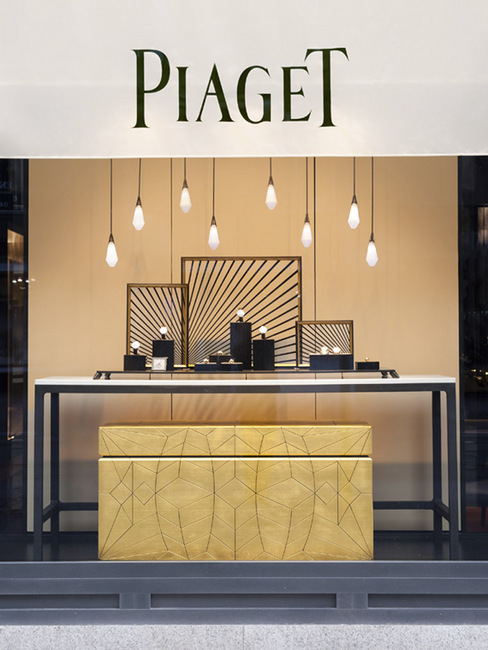 從飾有黑色、金色及藍色馬賽克磁磚的外牆到綠鏽色牆面,或橡木色織布家俱,處處流露出心靈手巧的人文細節,展現伯爵與傳統技藝的深刻連結;展示櫥窗的設計,猶如裝飾金色葉紋條版的大型珠寶盒,敬邀觀賞者一同體驗伯爵創作之奇幻美好,並以此向昔日工藝價值致敬。此造型概念源自過往鍊子製作商,自工坊大師手中接過成品或粗胚模型時,便是保存於形似的珠寶盒中,而這項傳統,在今日幾已逸失。