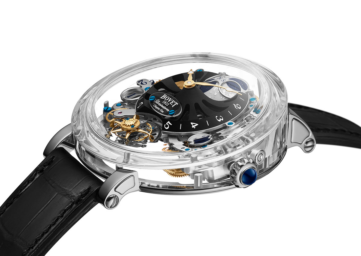 腕錶以藍寶石水晶打造,錶背設有以5級鈦金屬製成的機械切割錶圈及四個錶耳,機芯亦固定於錶背,而非設於中間。品牌以獲得專利的雙面飛行陀飛輪為此立體的精美腕錶機芯加以調節。此全新機芯的動力源自單一發條盒,即使具備眾多複雜功能,仍可提供10天的動力儲存。擁有兩項專利的球形差動上鍊系統解決了動能分配的問題。