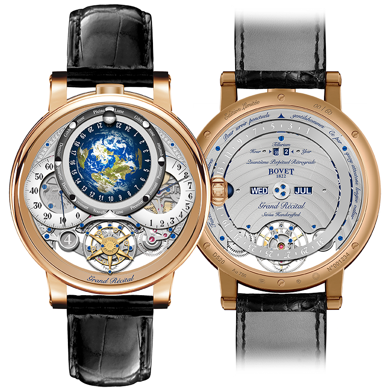 而另一款Récital 22 Grand Récital腕錶,構造有如天文儀,供日、月與地球悅目亮相。飛行陀飛輪象徵太陽,框架支臂代表光線,半球形的地球沿自己的軸心轉動,並以24小時制式顯示時間;細看下小巧的月球伴著地球,沿著軌道每29.53日完成繞地球一圈。陀飛輪的五條鈦金屬框架支臂圍攏著擺輪及擒縱系統,極富立體感,五臂修飾極細緻由人手屈成弧形,變身太陽烈焰光芒,框架並連著一支指針,由於陀飛輪每60秒自轉一圈,指針便負起指示秒鐘的責任。地球表面為一幅雕刻及手繪的地圖,細緻像真呈現海洋、山脈、沙漠及森林。