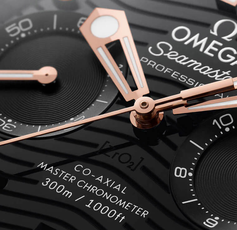 錶款的18K Sedna™金錶圈上還是覆蓋了陶瓷材質以及Ceragold™瓷金潛水刻度,同樣的,面盤的材質也是以陶瓷製成,歐米茄再用雷射鐫刻出上面的波浪紋,由於搭載機芯不同,因此海馬潛水300米計時碼錶的錶徑達到44mm,比三針款的錶徑要稍微大一點,因此也讓面盤更有空間可以容納計時功能的相關顯示,包括9點方向有小秒盤、3點方向有同軸的計時/計分盤,至於日期顯示還是設置在6點方向。計時款也一樣使用幾何造型夜光時標,不過由於小錶盤佔據面盤一定的空間,因此3點和9點方向的矩形時標也不得不跟著縮減面積,不過其依舊存在並一樣有夜光物料,確保在暗處的讀時效果不受影響。