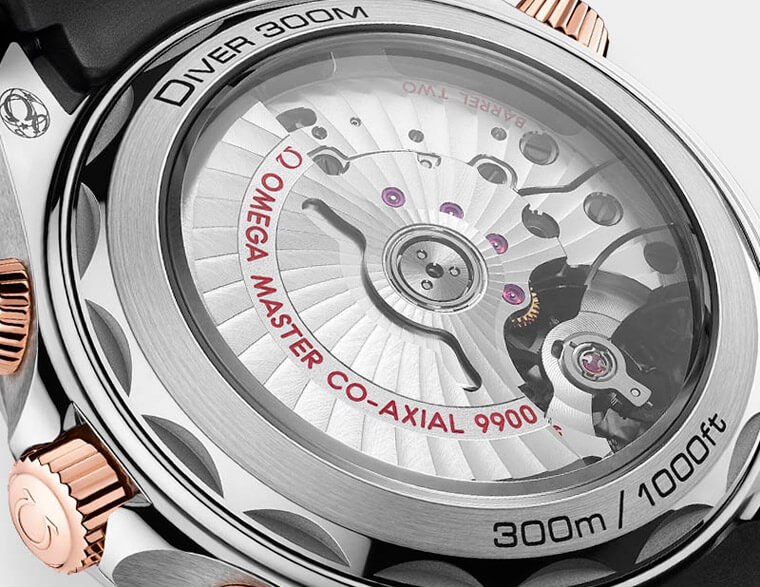 新款搭載的9900機芯先前分別在超霸Racing大師天文台手錶和海馬Planet Ocean 600米手錶等系列中使用過,這枚機芯具備導柱輪與同軸擒縱設計,沿襲歐米茄以及傳統計時碼錶的製錶元素,此外這款也採用了抗磁零件已通過大師天文台認證,確保它的抗磁能力即使不用軟鐵內殼保護也能衝高的15,000高斯的驚人水準,透過透明底蓋,機芯本身的做工以及修飾等都一清二楚,賞玩的價值隨之升高。