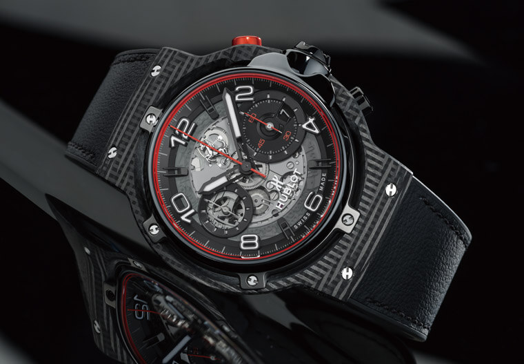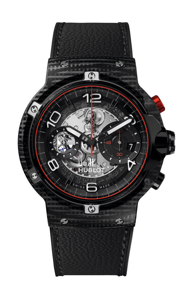立體碳纖維材質/HUB1280自動上鍊機芯/時、分、小秒、日期顯示/計時碼錶功能/藍寶石水晶鏡面、透明底蓋/防水100米/錶徑45mm/限量500只