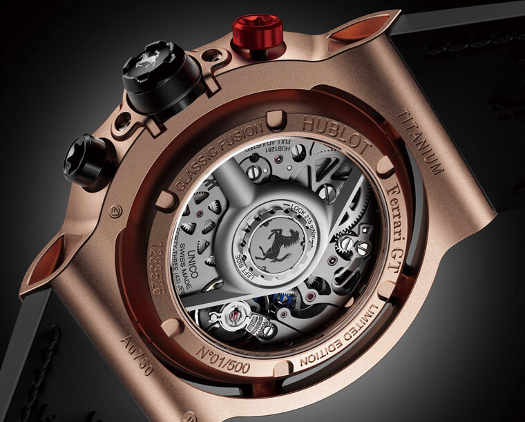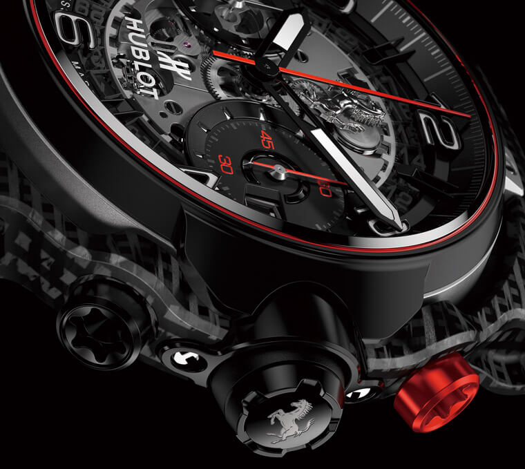 Classic Fusion FERRARI GT共推出鈦金屬、皇金與立體碳纖維三種材質,錶款同樣由法拉利設計團隊規劃外形,包括錶殼改良成猶如多層同心圓的疊合型態,由此突顯面盤吸引視覺的魅力,此外從面盤12點方向、錶冠與自動盤上的躍馬標誌、計時小錶盤刻度環與錶冠和計時按把的設計中,也強而有力透露出源自法拉利GT跑車的關聯;至於錶款搭載的HUB1280機芯為宇舶2018年才推出的第二款自製計時機芯,不僅擁有四項專利技術,還成功將機芯厚度降低至6.75mm,如此一來腕錶便能兼顧機能性、複雜工藝以及佩戴舒適度,無疑再度攀上法拉利聯名腕錶的新高峰。