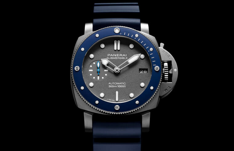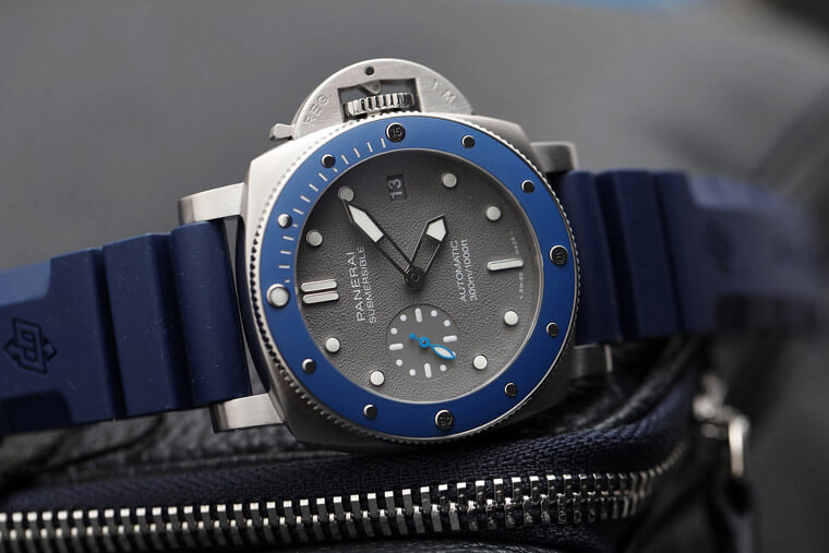 光看藍圈和灰色梨地面這兩點的話,PAM00959有點像是Guillaume Néry聯名款982的三針版本。42mm以沛納海的標準來看是比較秀氣的尺寸,而且品牌也一直到2017年才首度納入42mm這樣的尺寸,2019年的新款PAM00959維持了42mm的尺寸和不鏽鋼的錶殼,但錶圈追加了陶瓷色圈,並且將面盤改成了灰色,它不只選擇了少見於沛納海的灰色,盤面還做了大顆粒的梨地質感,看起來相當有特色。PAM00959換裝了2018年首度使用在Luminor Due 38mm、由Richemont Group中央提供的OP XXXIV機芯。OP XXXIV是由同集團卡地亞的1847修改而來的,近年包括名士、以及2019年新加入的IWC都使用了由這枚機芯衍生出來的型號,是現在Richemont愈形重要的一枚集團內通用機芯;如果單純比較P. 9010和OP XXXIV的數據,兩者都是三日鍊,震頻也都有28,800vph,規格上並沒有差太多,但就成本來說自製的9010無論如何還是比較高,但兩款機芯具體表現應該不會差太多,而且PAM00959在機芯這邊省下的成本反而得以用來升級陶瓷錶圈。