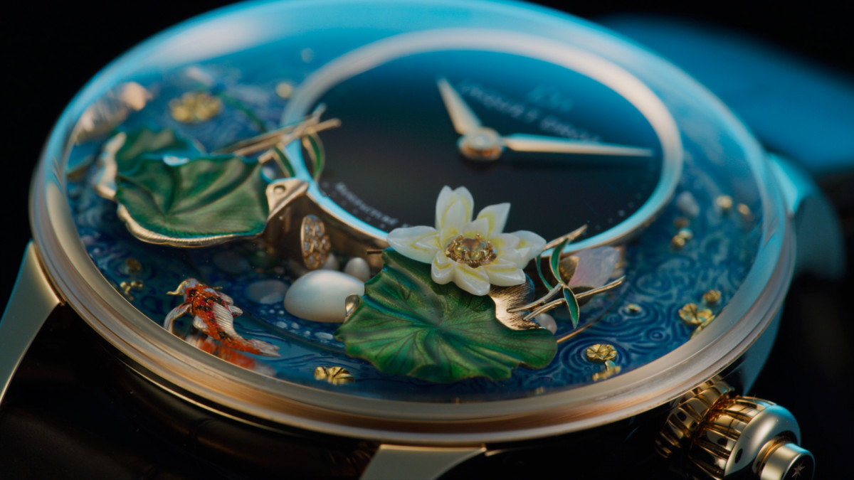 ▲品牌全新力作錦鯉幻蓮腕錶頌讚生命及永恆不息的生命輪迴。這款自動玩偶作品配備品牌內部設計和組裝的嶄新機制,可上演時長超過四分鐘的活動場景。一幅華麗的自然主義劇幕漸次展開,展現禪意花園的優雅安寧之美。
