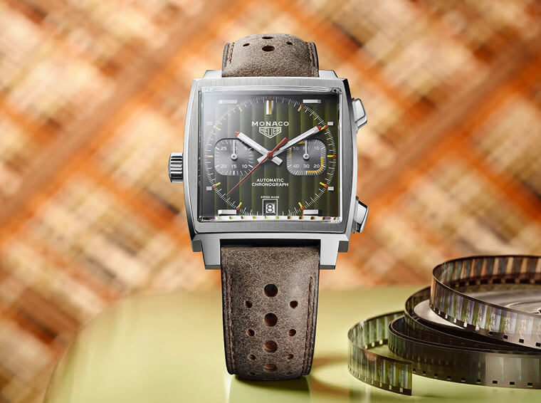不鏽鋼錶款配搭棕色皮革錶帶,錶帶孔內襯淺棕色,綠色面盤備有棕色和黃色元素,搭配日內瓦條紋裝飾,指針塗有SuperLuminova®夜光塗層。小面盤和錶冠位置讓人一眼即可辨識這款跳脫傳統的Monaco系列腕錶。錶款搭載著名的Calibre 11機芯,可以說是對1969年原版Monaco手錶首次登場的自動計時機芯的現代演繹版本。