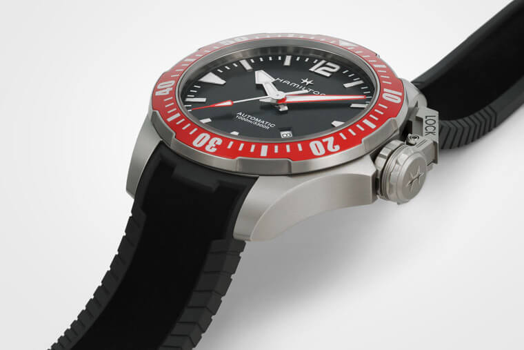 ▲錶款的外型是參考漢米爾頓1950年代所推出的古董潛水錶,最明顯的特徵就是貌似水壺的錶冠保護裝置。