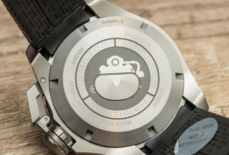 很多人第一眼看到Khaki Navy Frogman蛙人潛水錶都會對它的錶冠留下深刻印樣,除了錶冠看起來很大一顆,它的錶冠鎖定裝置也很搶戲,這種被品牌稱為「水壺」造型的錶冠鎖定裝置靈感同樣來自1950年代的漢米爾頓手錶,事實上我們看到的那顆錶冠只是水壺保護裝置的一環,想要操作錶冠調時間或上鍊必須先轉開它,接著才會露出內部的正港錶冠,這種設計對於保護錶冠和提升防水性能都有所幫助。由於錶款的防水性能達到1000米,所以它在左側錶殼設置了可以排除氦氣分子的隱藏式排氦閥確保錶主從水下上升到水平面的過程中,錶殼內部不會塞滿氦氣而爆裂。而錶背採用的實底蓋上頭刻印了潛水員的圖案來呼應手錶的運動本色,底下包覆的H-10機芯可以提供超過3日鍊動能,如果只是日常佩戴的話,實用性已經很夠用了。