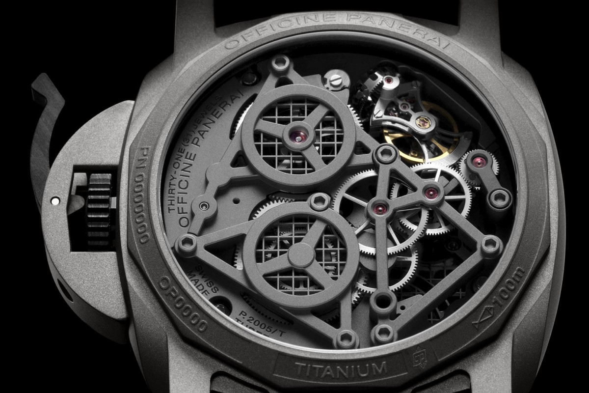 全新手錶採用具有6日動力儲存的 P.2005/T 機芯,面盤具備時、分、小秒盤及晝夜指示兩地時間功能,鏤空的面盤可完整透視整個機芯,搭沛納海與眾不同的水平陀飛輪擒縱系統,勾勒出極為複雜的幾何圖形,充滿強烈的建築美學。