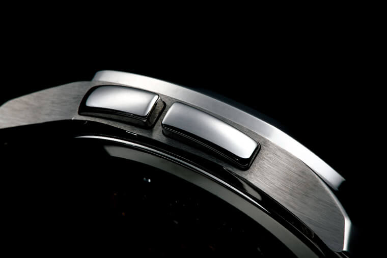 ▲錶款在左側分別有兩枚快調按把,可以按順時針和逆時針方向快調所在地指針,省去旋轉錶冠慢慢調時的困擾。