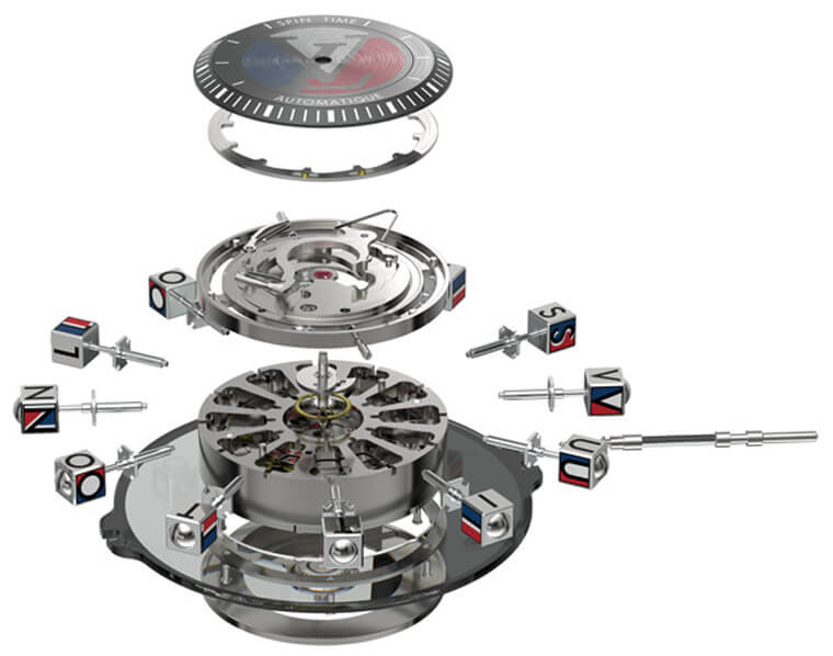 ▲過往Spin Time機芯往往被半透明底蓋所遮蔽,全新的"Air"版本雖然仍無緣窺見機芯內部結構,但是這次翻轉方塊的四面都能清楚窺見。