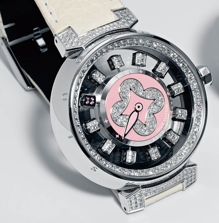 新款的Tambour Spin Time Air一口氣推出三款男錶和四款女錶作品,全部搭載LV88自動機芯並採用白金材質,錶徑無分男女款皆為42.5mm,男女錶的規格完全一樣,主要差別在於設計細節,如男錶在面盤中央可見LV符號,女錶則改以Monogram花朵圖案顯示,前者的翻轉方塊以真漆和緞面磨砂處理製成,後者則是以彩寶鑲嵌提升華麗感,女錶就連錶圈與錶耳部分也同樣可見鑽石鑲飾,錶款一如其名讓翻轉方塊彷彿騰空懸於面盤中,原本就極具張力的觀賞性因而提升到另一個層次,再次體現出路易威登不受限的豐沛製錶創意。
