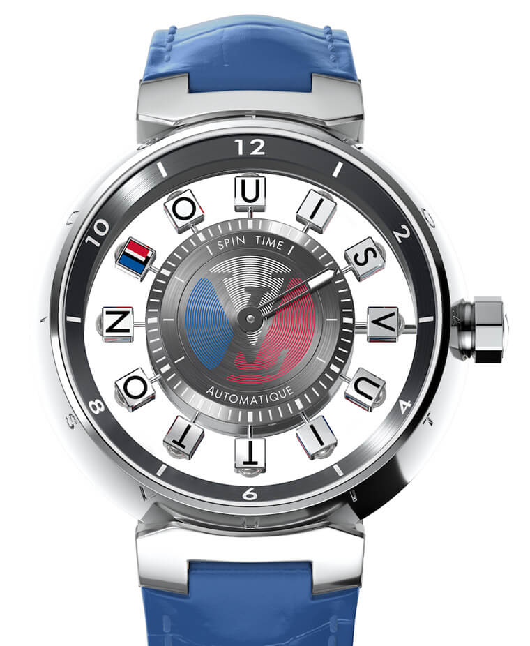 Spin Time顯時機制的原理大致是將小時從輪系帶動指針的形式改良成以12個翻轉方塊來顯示,每一個方塊都有四面,其中兩面顯示當天的午前與午後的小時數(如12點與24點),每到整點時上一個小時時刻與當前小時時刻的方塊必需同步翻轉,由此展現機芯結構的創意以及製作難度。Spin Time歷經十年的演化,其中除了最初版本的兩地時間與時分顯時,也曾出現改用方塊顯示第二地時間的Tambour Evolution Spin Time GMT或是結合Escale彩繪幾何圖案概念的版本,2019年正值Spin Time問世的十週年,為此路易威登開發出嶄新的Tambour Spin Time Air,以鏤空設計帶有的通透視野,聚焦方塊顯時機制的特殊視覺魅力。