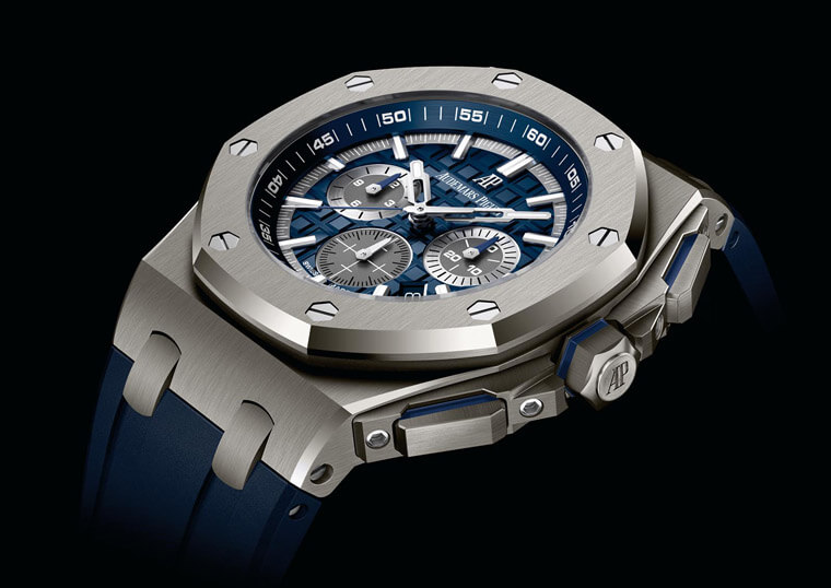 這款有點像隱藏版的新款皇家橡樹離岸型計時碼錶外殼尺寸維持系列常用的42mm,但是它跟同樣尺寸的另一款自動計時錶在按把設計上不太一樣,前者是圓柱形按把,新款則是比較接近44mm款式那種扁長型設計,但是它的按把設計又帶有折角和平整的切面,與44mm帶點弧形的按把也不是完全一樣。這款採用的是鈦金屬錶殼,而且有點讓人意外的,它反而是裝上了實底蓋,看到這裡你可能會認為也許它的防水性能會跟ROO潛水計時錶一樣好甚至更高,但事實又非如此,它還是維持系列基本的100防水性能,因此比起機能性,外型上的微調可能才是這款的重點。