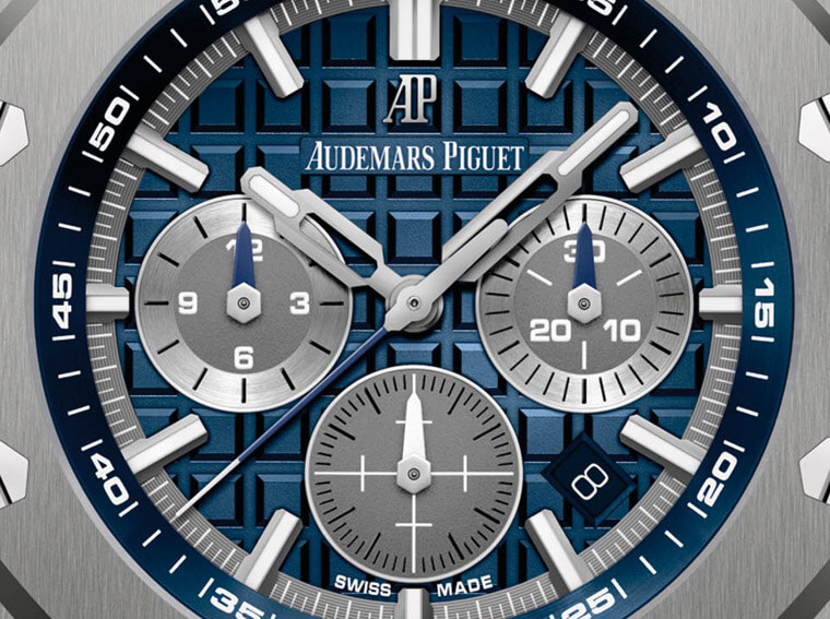 原本ROO計時碼錶家族的三種款式分別配置了左三眼計時盤以及雙眼計時盤,然而這款全新的皇家橡樹離岸型計時碼錶則是別開生面改成了下三眼的計時錶盤步局、日期窗則是介於4~5點之間,是不是覺得有點熟悉呢,沒錯這款由於搭載的是跟皇家橡樹系列計時碼錶同款的機芯,所以面盤格局反而更像是皇家橡樹那一派,只是它的格紋是更大號的Méga Tapisserie、三眼錶盤也做得比較粗獷些(從刻度環的比例還有變粗的指針這些部分可以看出),此外ROO系列因為習慣把設置秒數與分鐘雙環刻度,所以使得錶款面盤看起來會比較緊湊,至於這款雖然也使用了幾何造型時標,但是它的時標和指針造型都有別於系列其他的計時碼錶,屬於全新的設計,看起來也是往突顯運動風的路線修改。