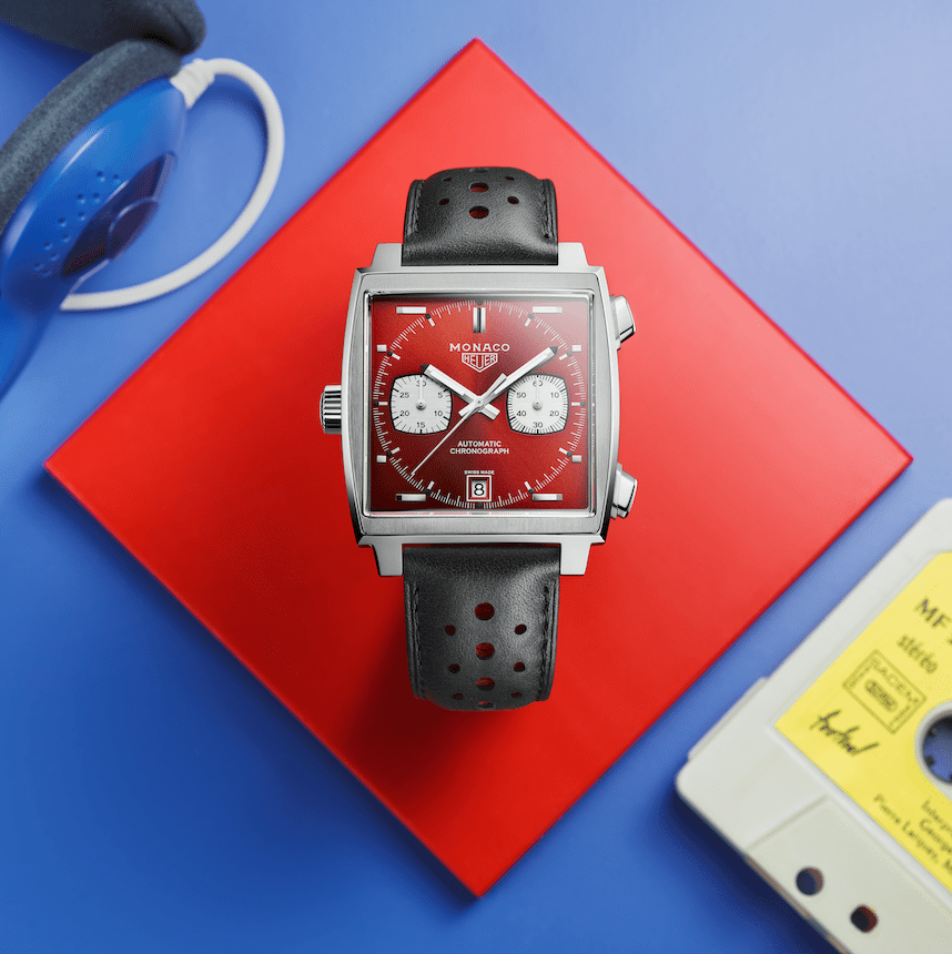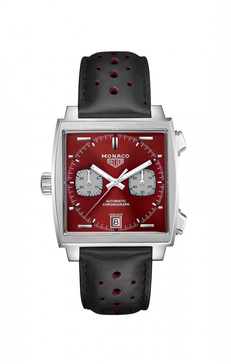 第二款手錶造型熱情奔放,鮮豔的紅色面盤展現前衛設計並象徵賽道上的勝利。此特別版採用黑色小牛皮錶帶,錶帶孔以紅色內襯,完美捕捉第二個十年的飆速歷史與時尚風潮。手錶材質為不鏽鋼,並延續經典方形錶殼設計,結合放射紋紅色錶面與兩個圓角鍍銠副面盤。