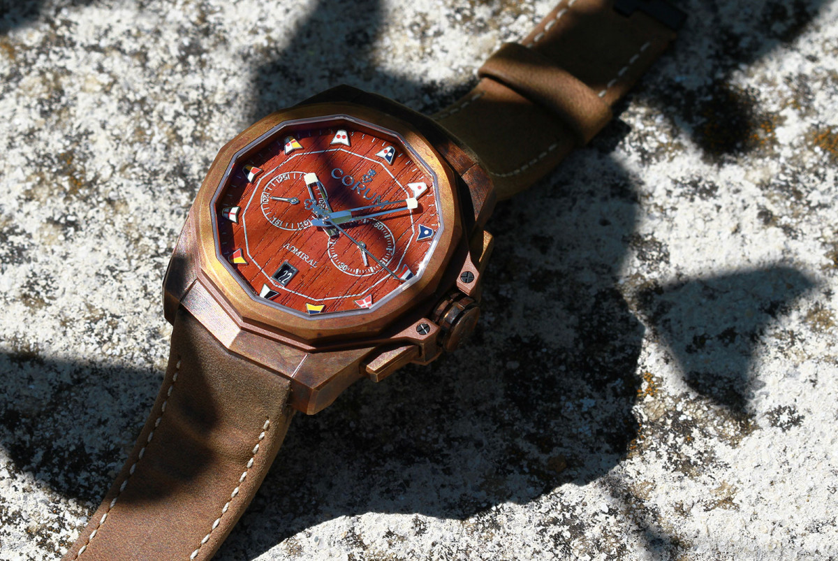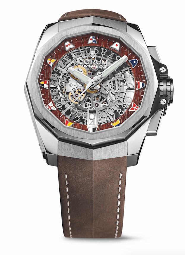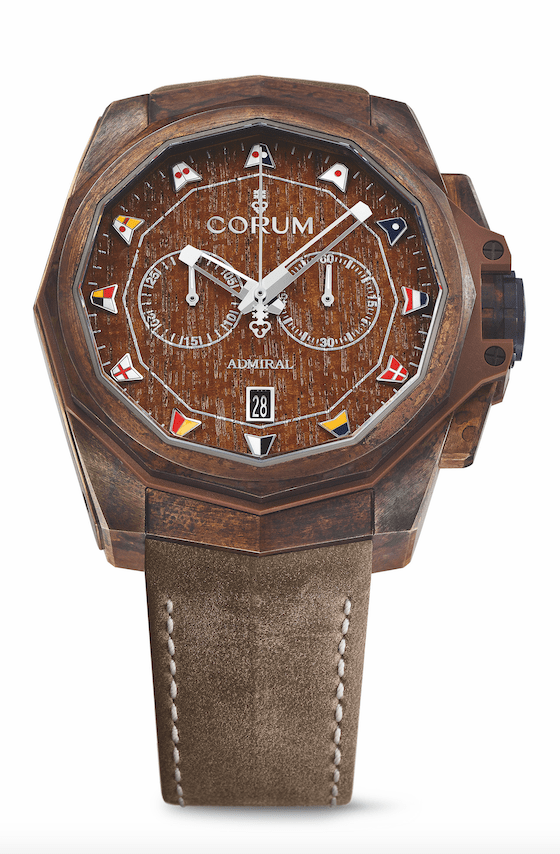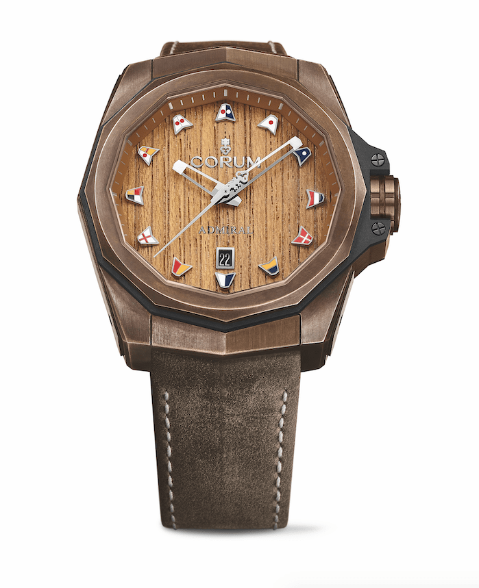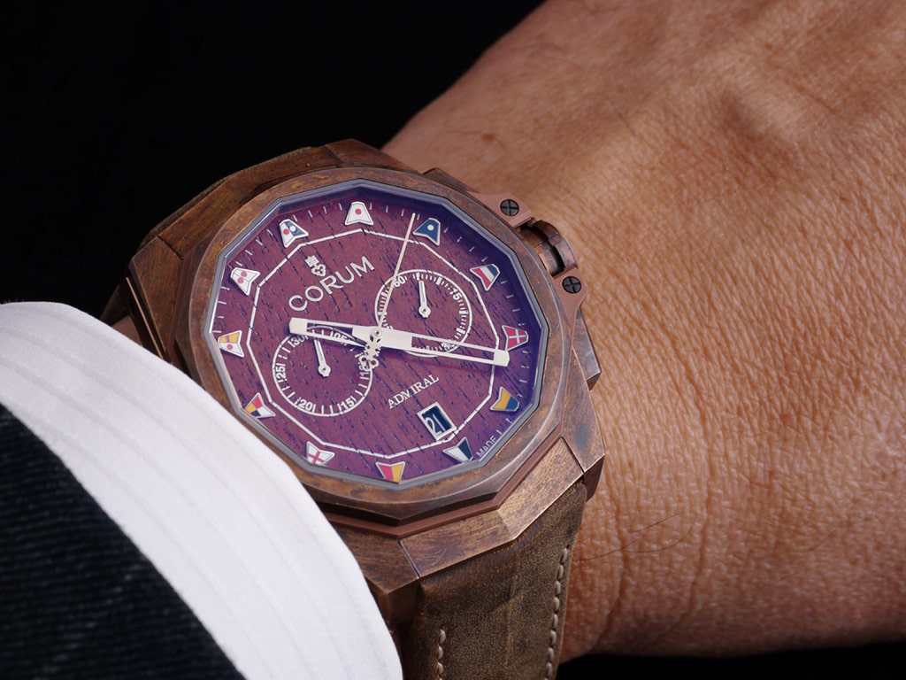 腕錶另一個特色則是面盤特別採用柚木材質製作而成,如此獨特的材質,除了讓色調上與舊化青銅材質錶殼相映成趣,柚木與青銅這兩種材質也是過去帆船上經常使用的材質,讓這款手錶從外型、設計等各方面呼應著帆船主題。當然,作為Admiral海軍上將系列,招牌12面海事旗飄揚在面盤之上,醒目的配色也成了面盤上最佳點綴。除了青銅計時碼錶,Admiral AC-One 45還有柚木面盤系列自動及鏤空等款式,以不同面貌傳遞著CORUM崑崙錶的品牌DNA。