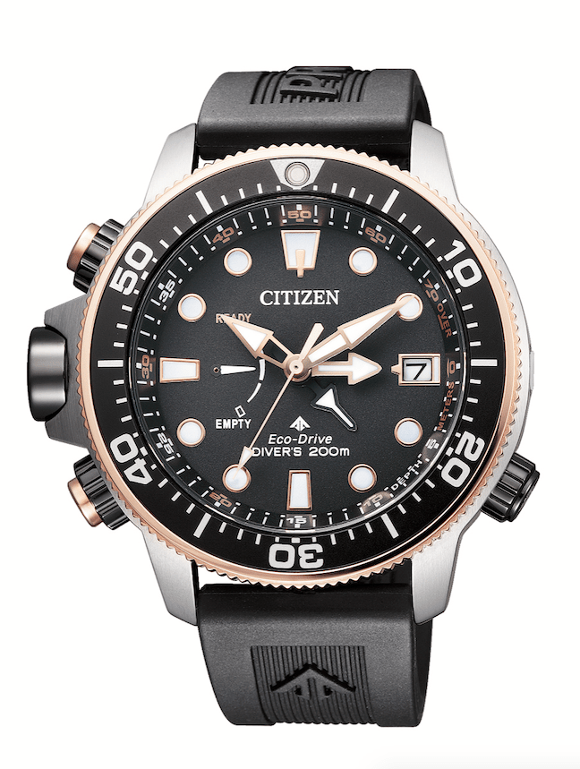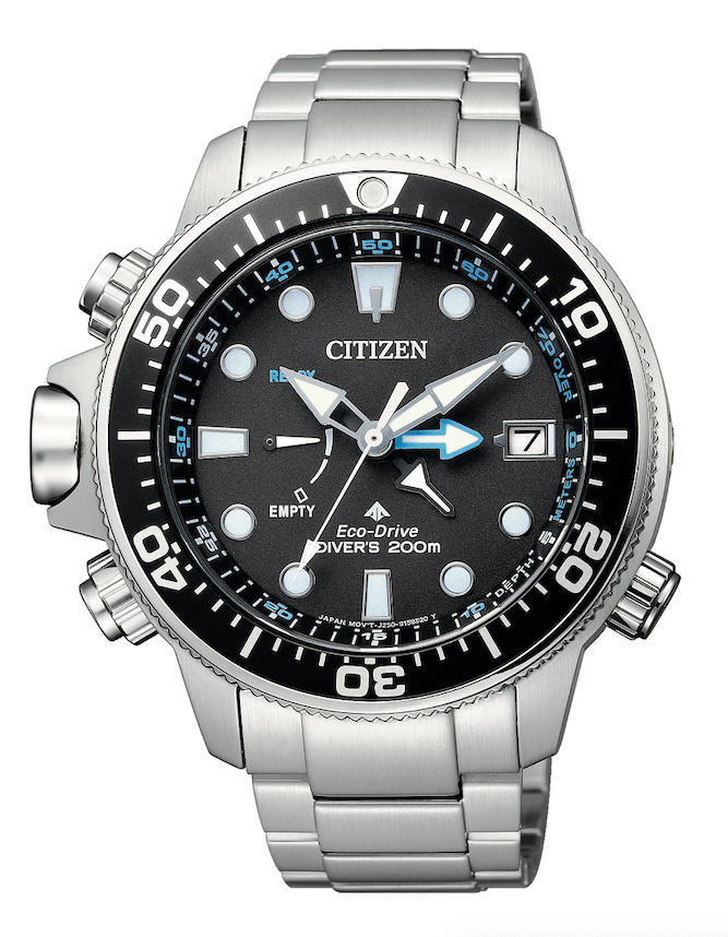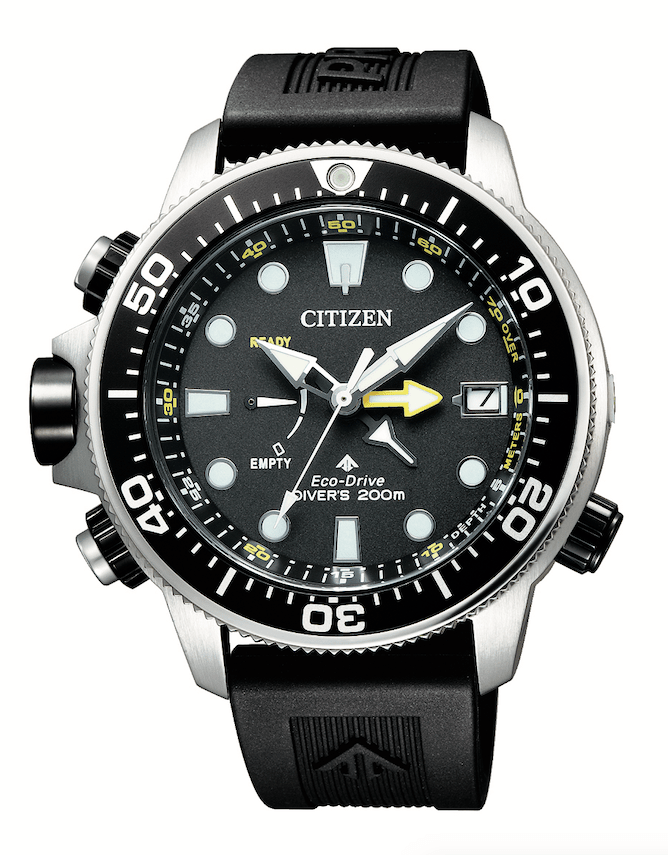 不鏽鋼材質/光動能機芯/時、分、秒、日期顯示/深度顯示/電量等級顯示/上升速度警告鈴/強化玻璃鏡面/防水200米/錶徑46.1mm/參考價:NT$ 25,800