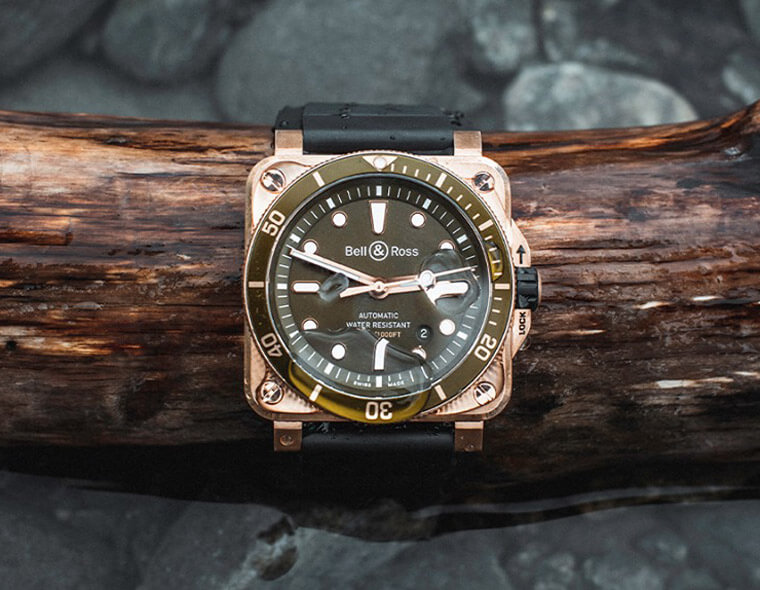 ▲同樣的造型,BR 03-92方形潛水錶搭配不鏽鋼、陶瓷或是青銅錶殼就能呈現不一樣的個性,例如青銅款往往會讓人感到較具復古氛圍。