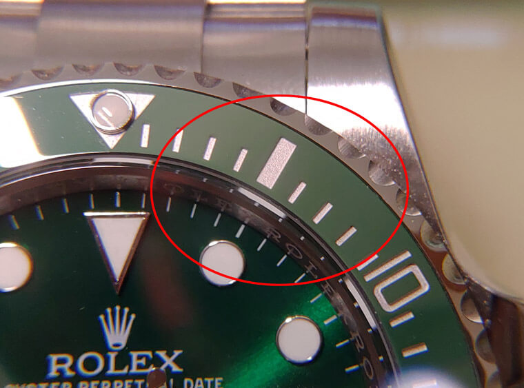 目前的山寨綠水鬼普遍都修正過綠陶瓷圈的顏色,看起來跟正貨差不多,但是從陶瓷圈表面刻度的倒角就能看出差別,山寨綠水鬼往往不會費工倒角,這點從陶瓷圈反光時觀察刻度周圍有沒有曲面的光暈就可以判別有無倒角處理。